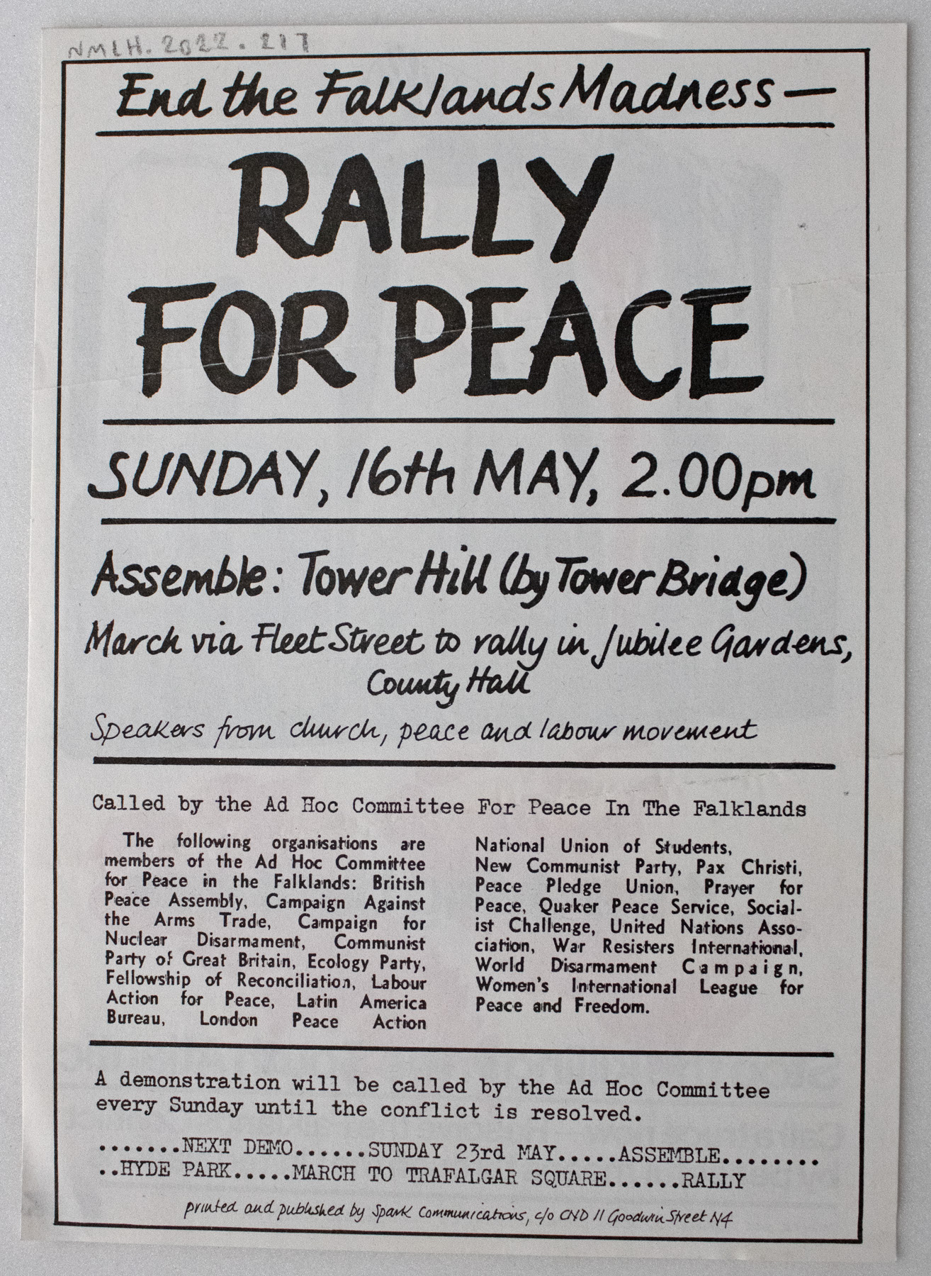 The flyer was printed and published by Spark Communications for the Campaign for Nuclear Disarmament (CND). Text on the back reads: "End the Falklands Madness / RALLY FOR PEACE / Sunday, 16th May, 2.00pm / Assemble: Tower Hill (by tower bridge) March via Fleet Street to rally in Jubilee Gardens, County Hall / Speakers from church, peace and labour movement" This is followed by a list of speakers and organisations that were to be at the event.