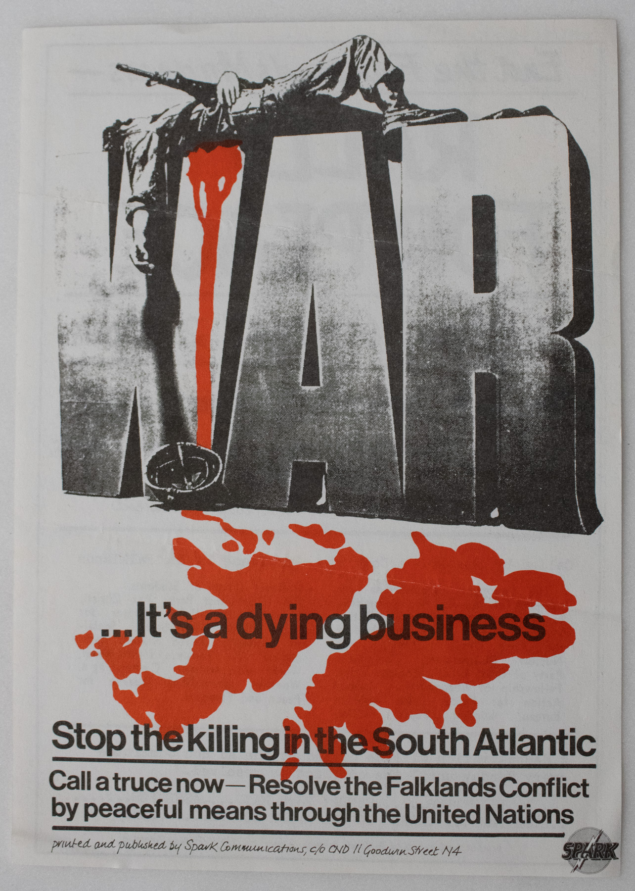 A white flyer with large block letters reading "WAR" and red bloodstains in the shape of the Falklands. This flyer was produced in 1982, advertising a march in protest of the Falklands war, an undeclared war between the UK and Argentina over island territories in the South Atlantic Ocean.