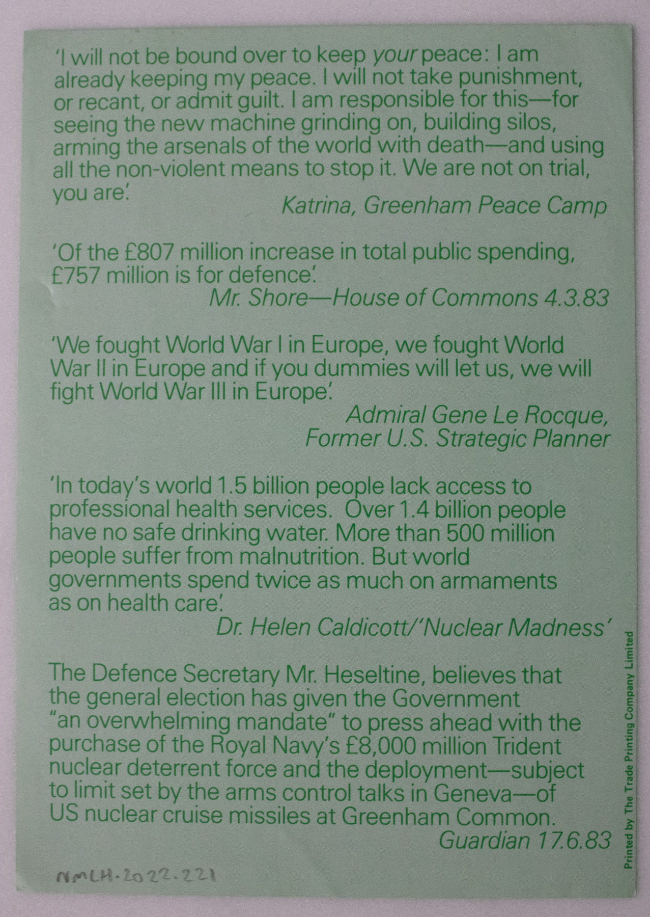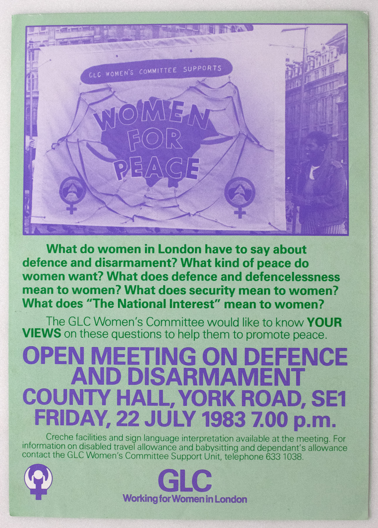 A green leaflet produced by GLC (Greater London Council) Working Women in London advertising a meeting on the topic of defence and disarmament. The leaflet features a picture of a Women For Peace banner. Green and purple text reads: "What do women in London have to say about defence and disarmament? What kind of peace do women want? What does defence and defencelessness mean to women> What does security mean to women? What does 'The National Interest' mean to women? / The GLC Women's Committee would like to know YOUR VIEWS on these questions to help them promote peace / OPEN MEETINGS ON DEFENCE AND DISARMAMENT COUNTRY HALL, YORK ROAD, SE1 FRIDAY 22ND JULY 1983 7.00 p.m. / Creche facilities and sign language interpretation available at the meeting. For information on disabled travel allowance and babysitting and dependant's allowance contact the GLC Women's Support Unit, telephone 633 1038"