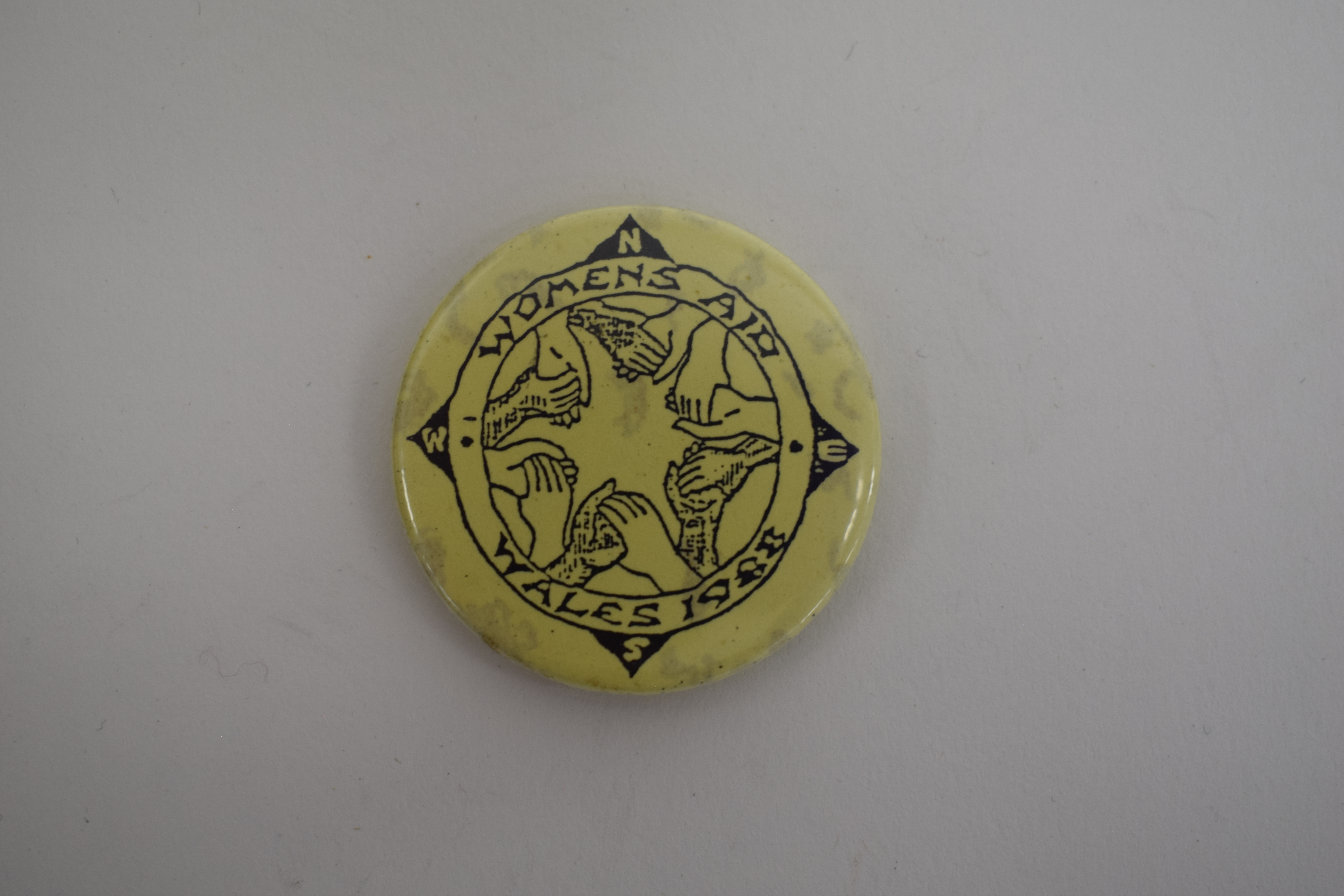 A yellow badge reading "Women's Aid Wales 1988" around an illustration of clasped hands. The design is made to look like a compass, with the letters "N E S W" printed around the outside. Women's Aid Wales is an organisation that campaigns to end violence against women, including offering support and services to survivors of domestic abuse.