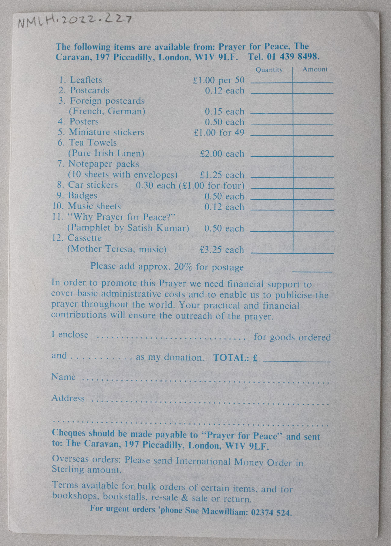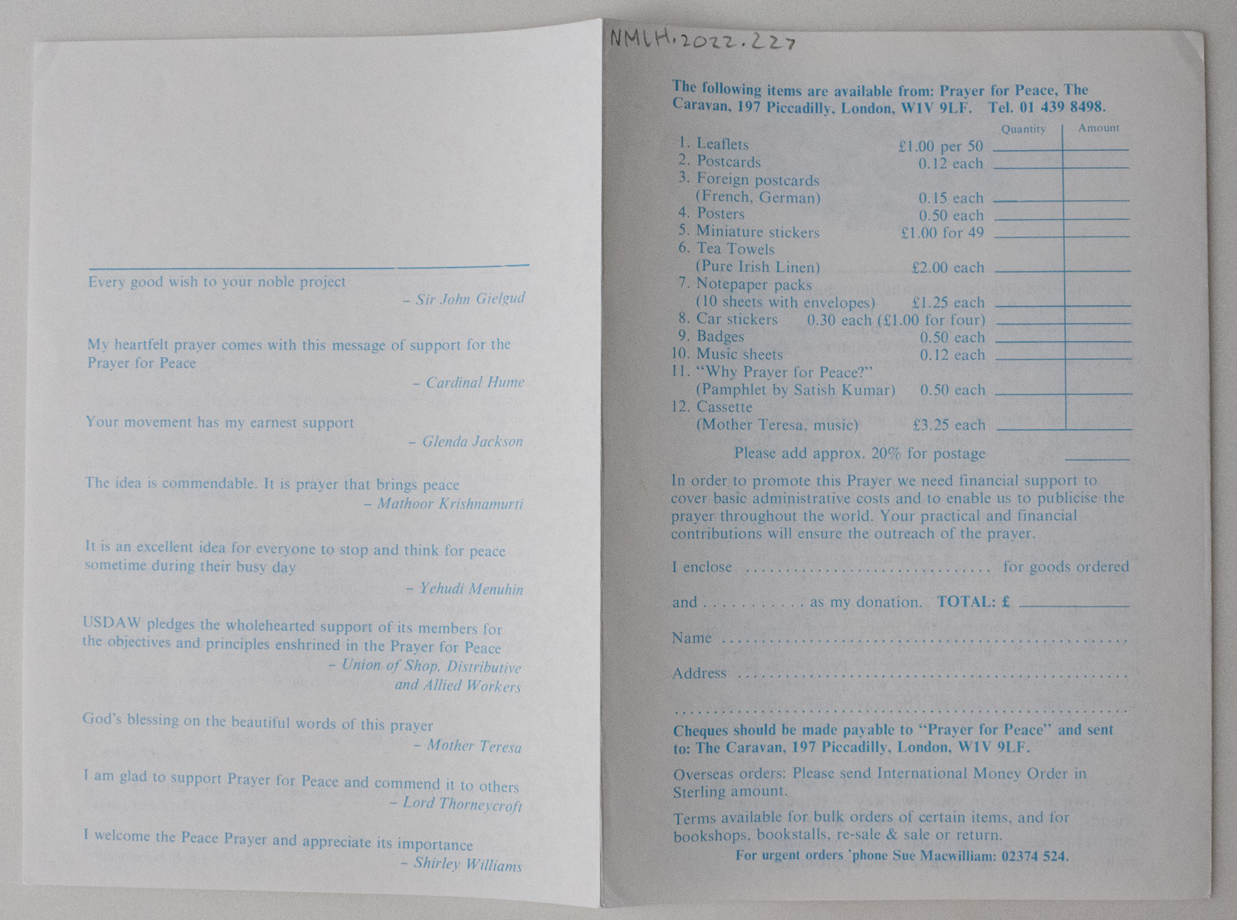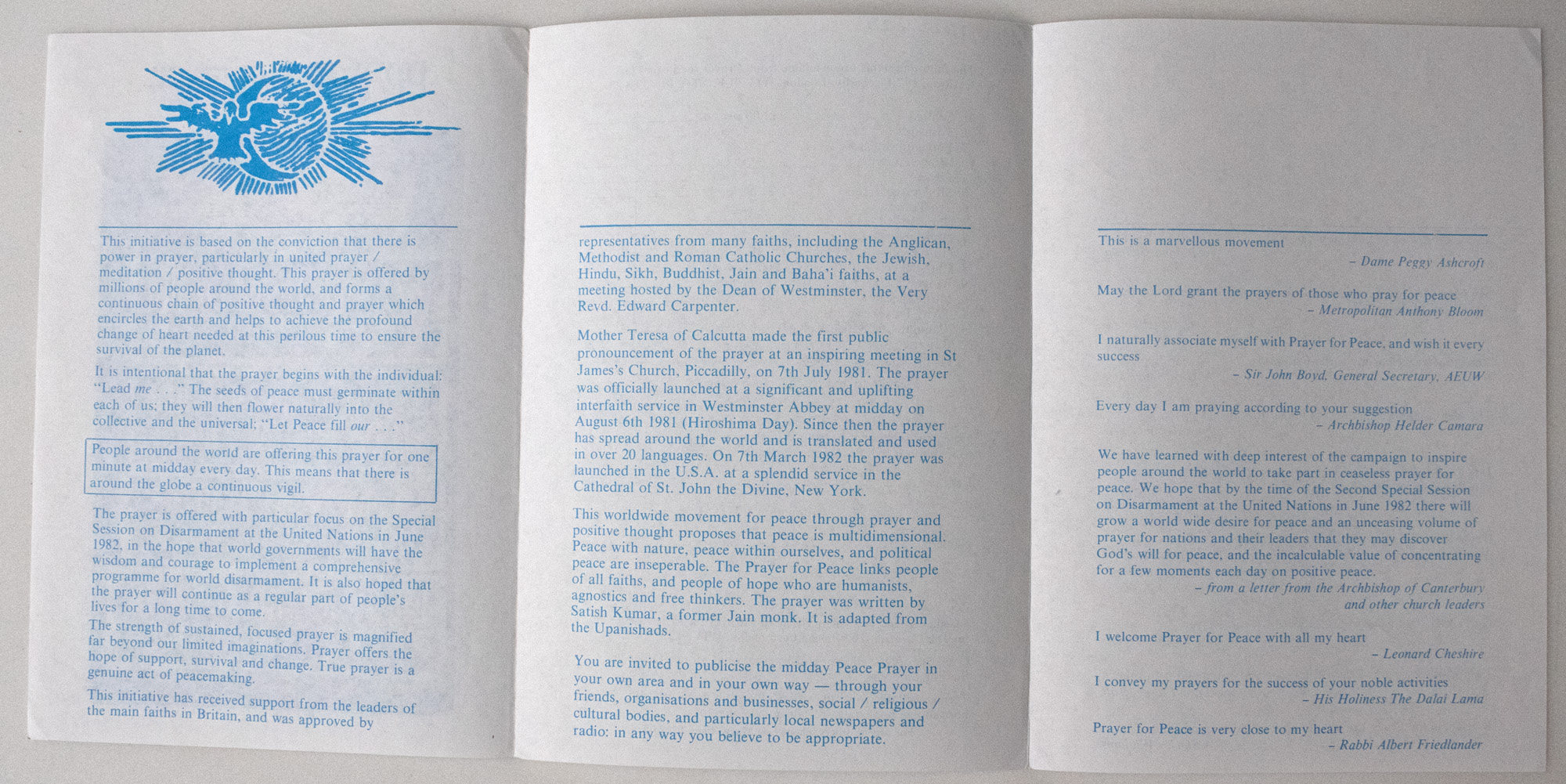 remainder of the leaflet discusses ways in which the prayer can be publicised, and then has an array of quotes from different religious figures, such as the Dalai Lama, the Archbishop of Canterbury, and mother Theresa. This leaflet was made in the midst of the Cold War, in efforts to aid disarmament and peace.