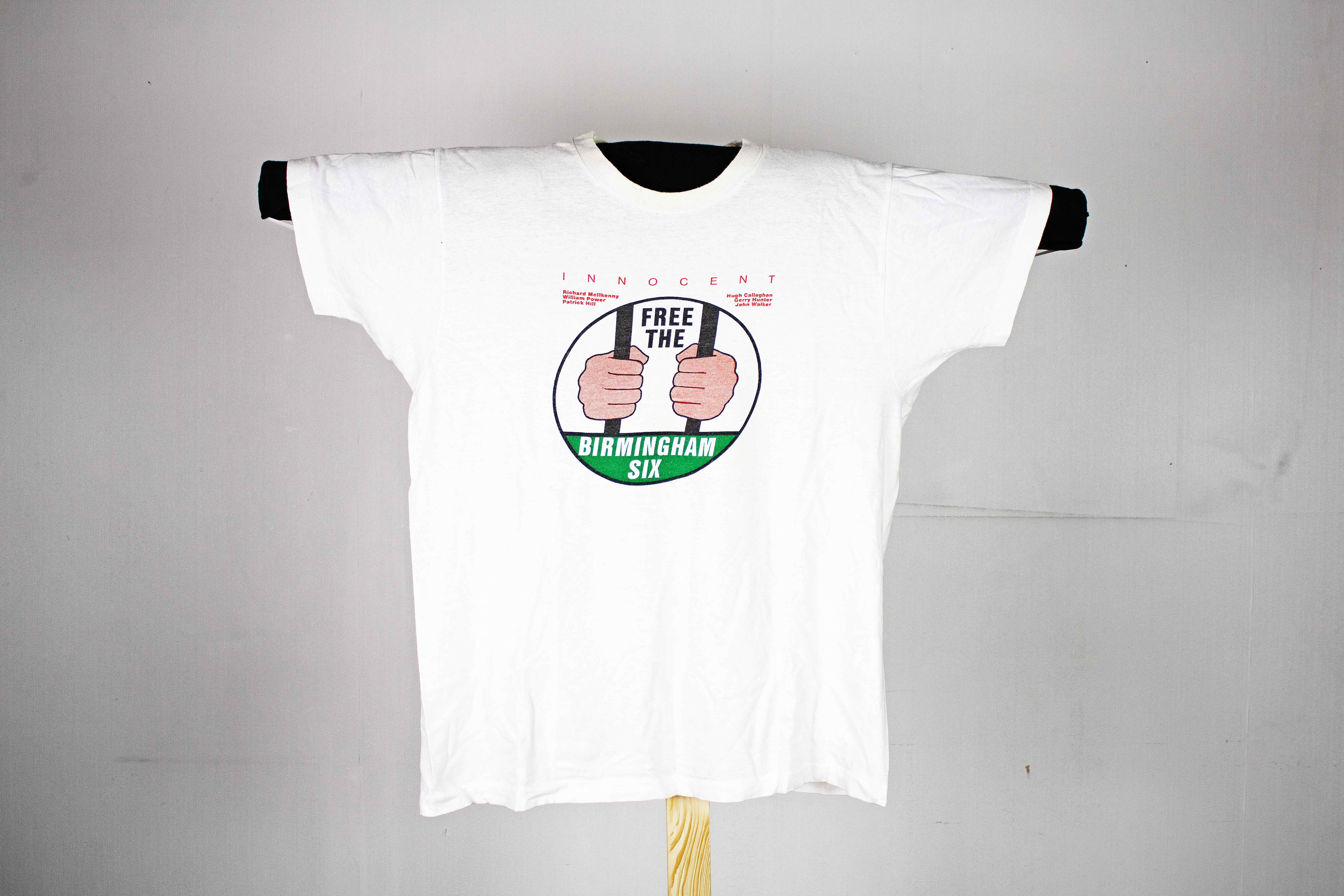 This is a large white t-shirt, with red text and an image in the middle. This reads "INOCCENT Richard Mcllkenny, William Power, Patrick Hill, Hugh Callaghan, Gerry Hunter, John Walker." Underneath this there is a large circle with text inside saying "free the Birmingham Six" with two hands round two prison bars.