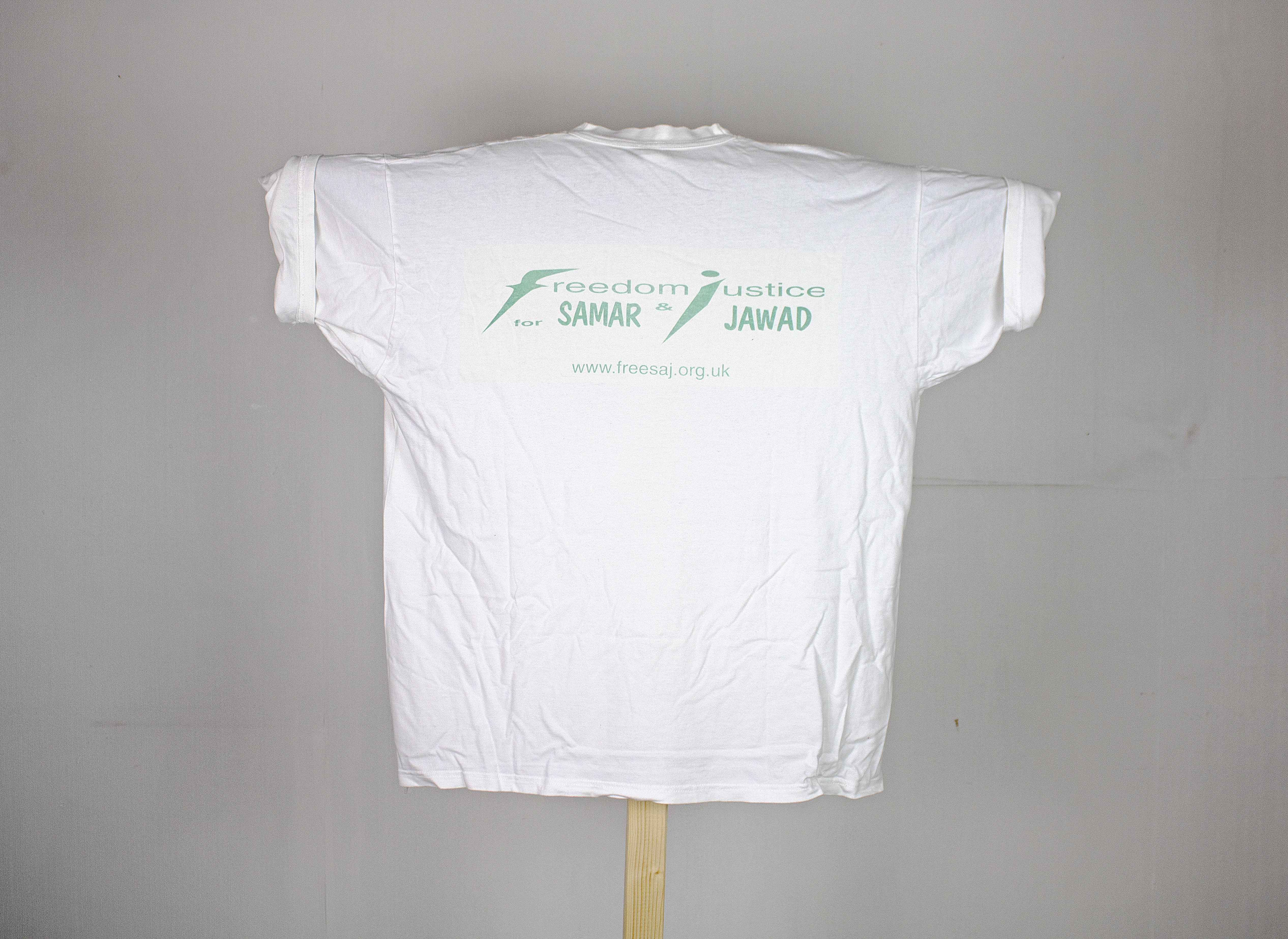 Large white cotton t-shirt with text on the front and back. The front of the t-shirt has grey text reading "Samar and Jawad are innocent." This is accompanied by two photographs printed onto the t-shirt, one of Samar Alami smiling, the other photograph of Jawad Botmeh. The back of the t-shirt has green text saying "freedom, justice for Samar and Jawad. www.freesaj.org.uk."