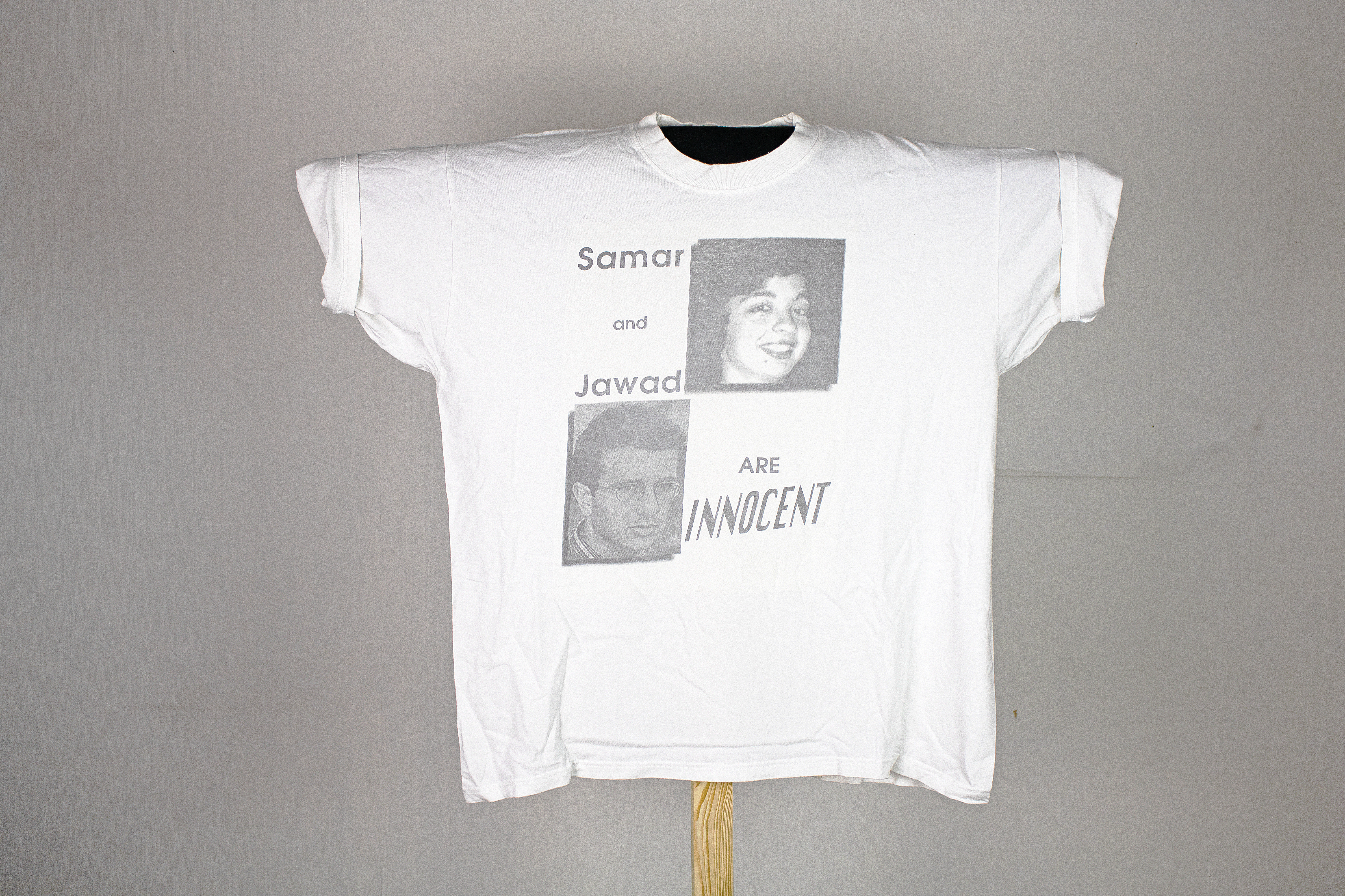 This t-shirt is in regards to the 1994 London Israeli Embassy bombing. The 1994 London Israeli Embassy bombing was a car bomb attack on 26 July 1994 against the Israeli embassy building in London, England. Twenty civilians were injured. Two Palestinians, Jawad Botmeh and Samar Alami, were wrongly convicted for the bomb attack. Alami and Botmeh were convicted of conspiracy to cause explosions in the United Kingdom. During the trial Alami and Botmeh were accused of being part of a team that had planned the bombing but were not accused of planting the bomb themselves or being present at the scene of the crime. There was no direct evidence linking the suspects to the bombing. In the course of the trial, both suspects did admit that they had conducted experiments using home made explosives in order to pass information back to Palestinians in the occupied Palestinian territories. Botmeh and Alami were convicted of the charges in December 1996, receiving 20-year sentences. Alami and Botmeh
