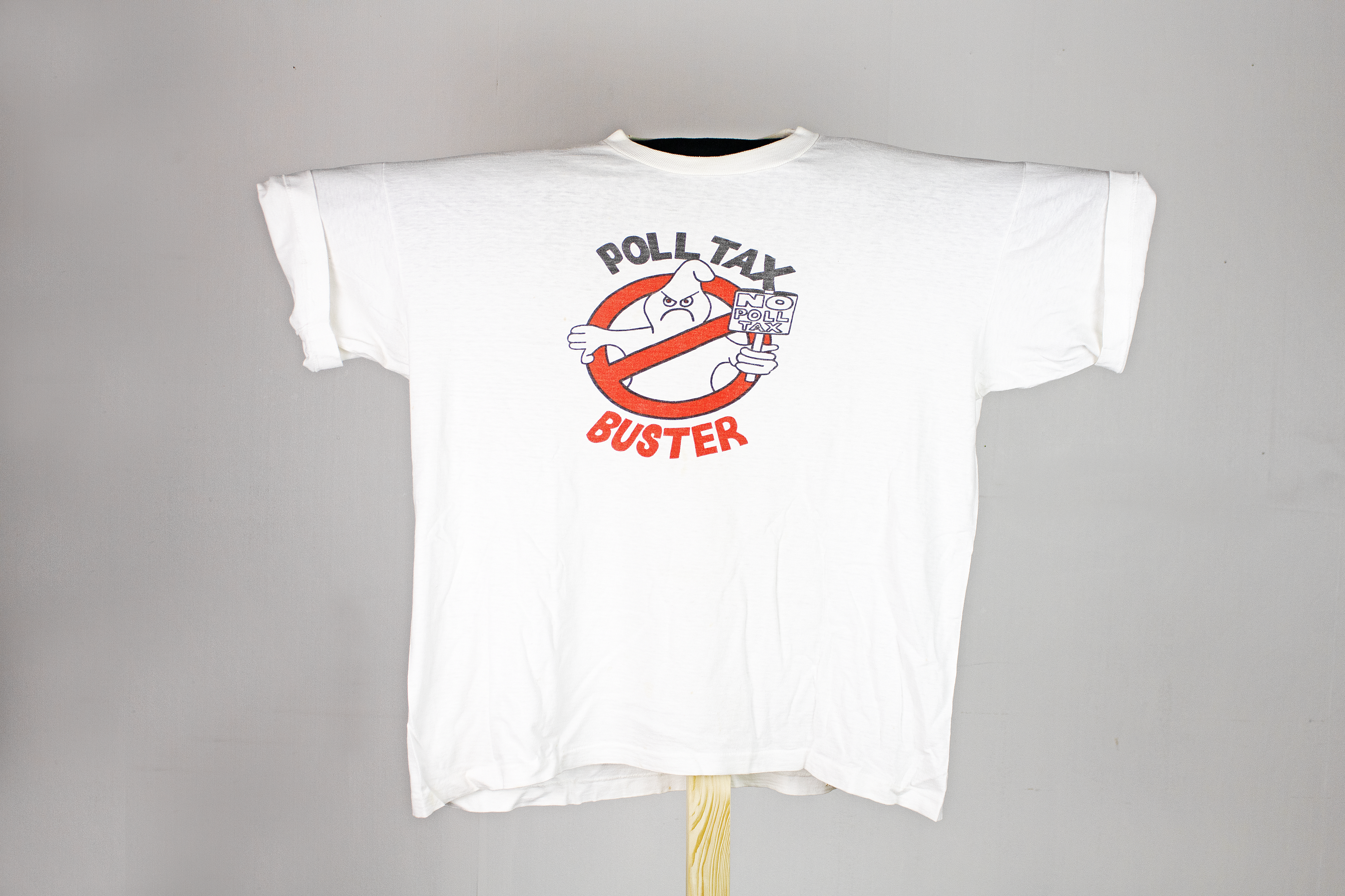 A white t-shirt with the Ghostbusters logo- a white ghost inside a red circle with a cross- and black text reading "Poll tax buster". The ghost is holding a sign reading "No poll tax" with an angry expression.