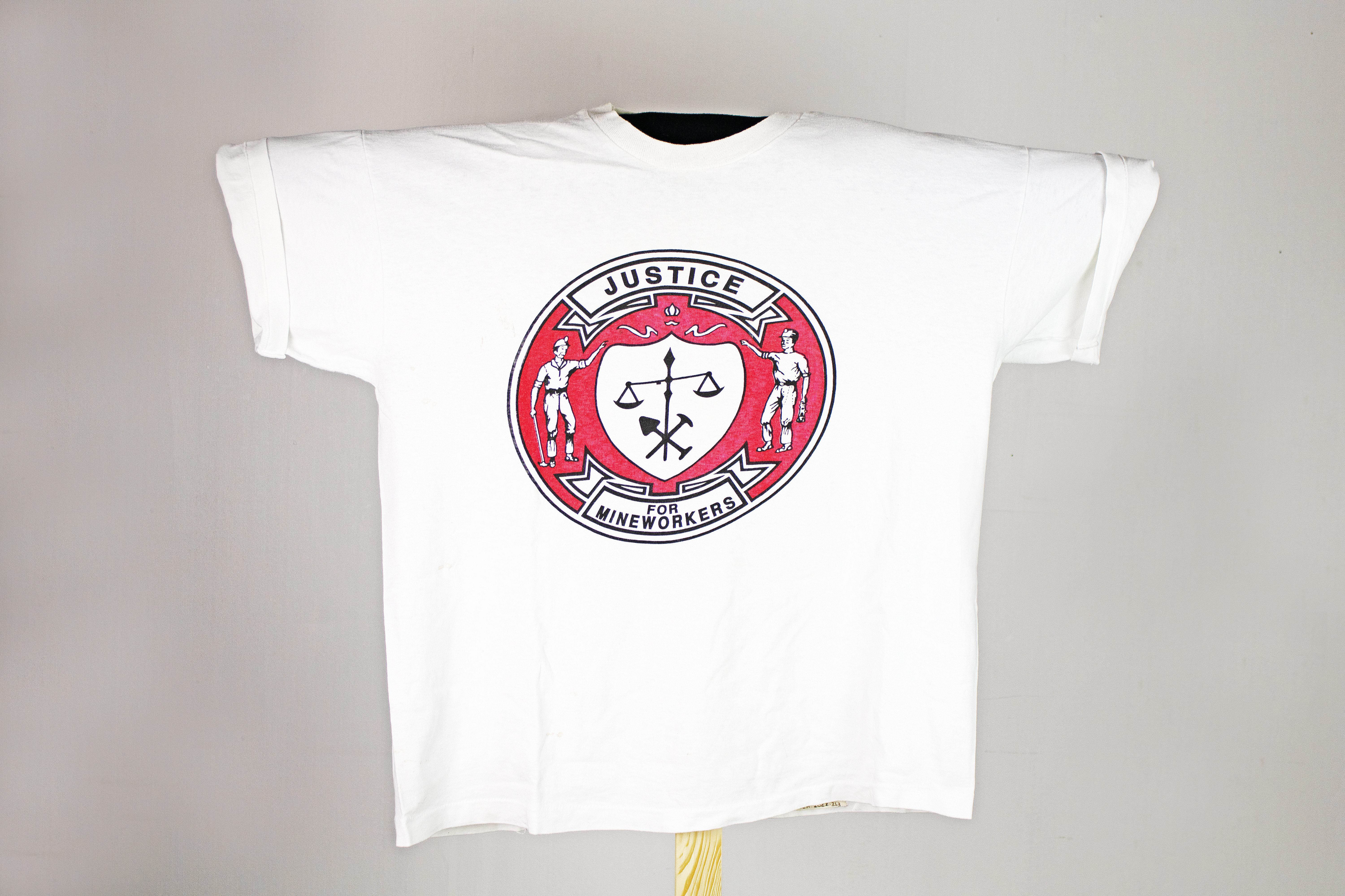 A white t-shirt featuring a red circle amblem with two men around a justice scale. One is holding a shovel and the other a miner's lamp. Black text in white banners reads "Justice for mineworkers". This t-shirt was made around the time of the 1984 miner's strike, when Margaret Thatcher's proposed pit closures drove mineworkers throughout the UK to go on strike.