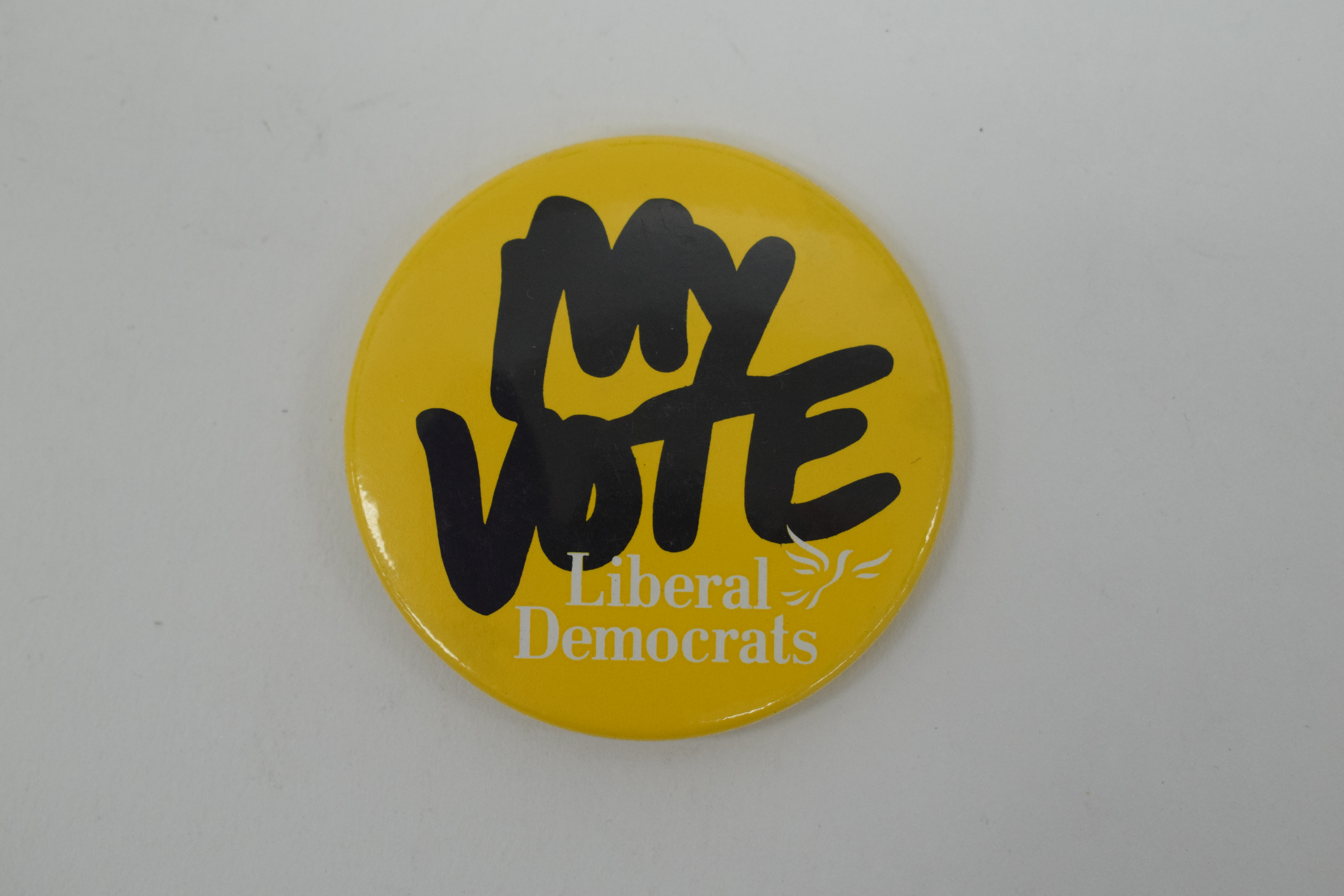 Circular yellow badge, "MY VOTE - Liberal Democrats", produced around 1981. The Liberal Democrat logo, an outline of a bird, is also featured in white. The badge has a plastic backing with a metal pin fastening. The back reads "PAT No 2137585 Reg. Design No 1012837".