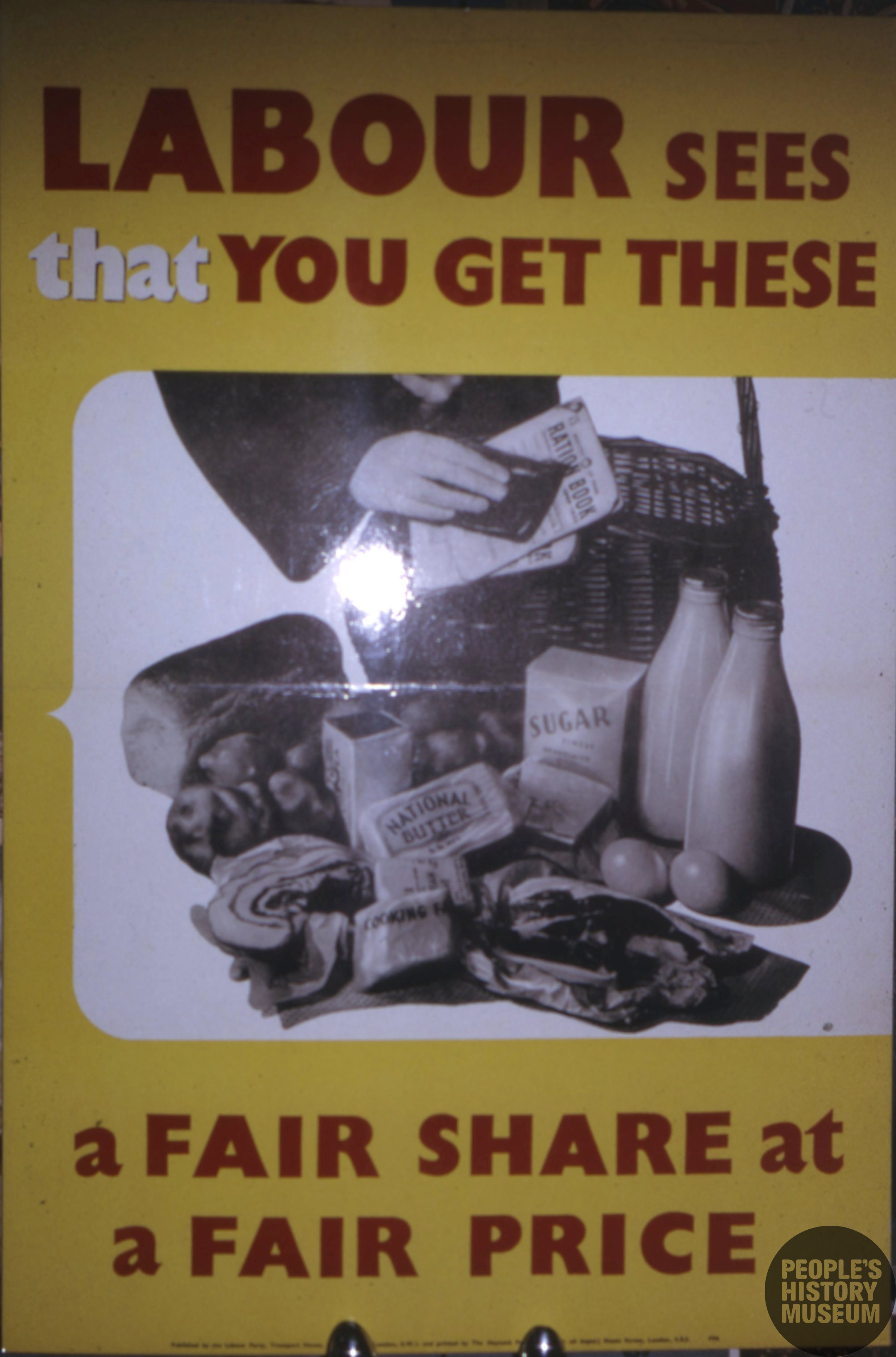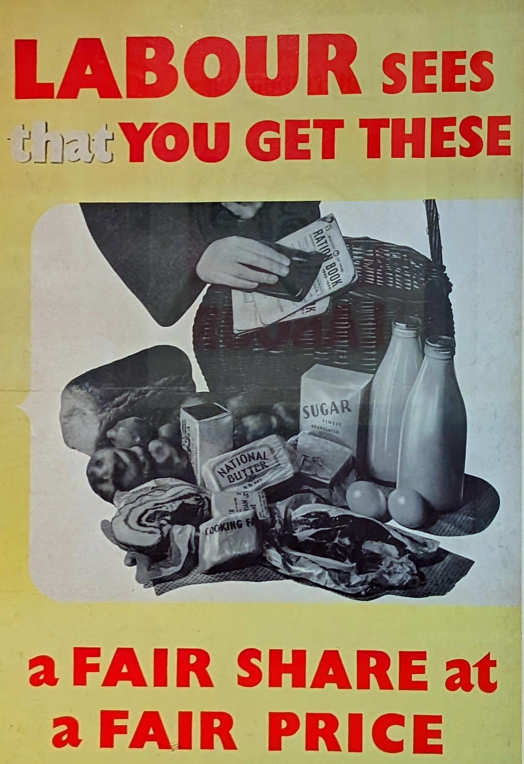 A yellow poster containing a black and white picture of grocery shopping, and a person's hand holding a ration book. 'Labour sees that you get these. A fair share at a fair price.'