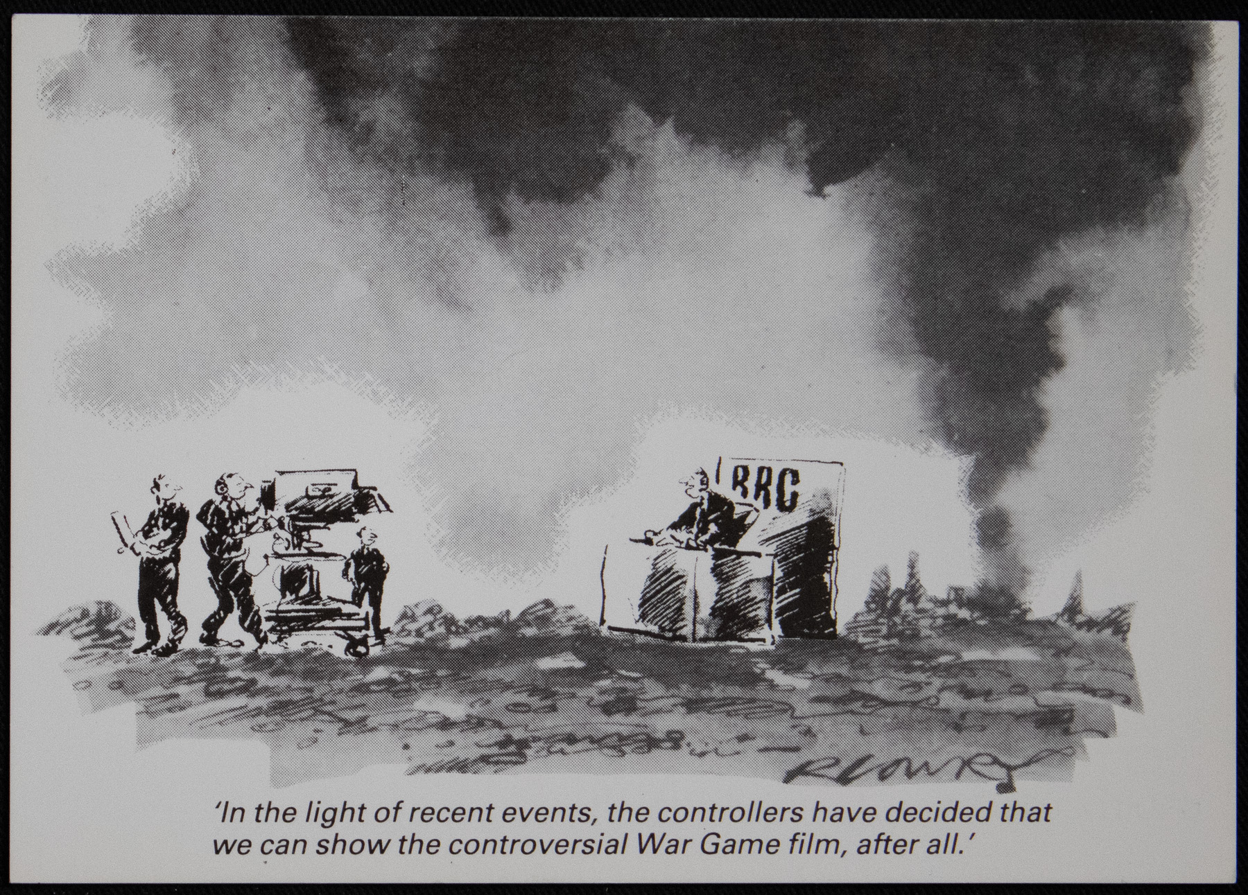 Black and white postcard. There is a cartoon in the front of the postcard showing dark clouds, looks like a warzone/a site where there has been an explosion. The image shows a man sitting down at a booth, with a sign saying "BBC" behind him. There are three cameramen with a large camera, which is pointed towards the man at the BBC booth. There is black text at the bottom of the postcard, which appears to be a quote from the BBC man - this reads: "In the light of recent events, the controllers have decided that we can show the controversial War Game film, after all." The reverse of the postcard shows a "Leeds postcards" logo and Leeds postcards address.