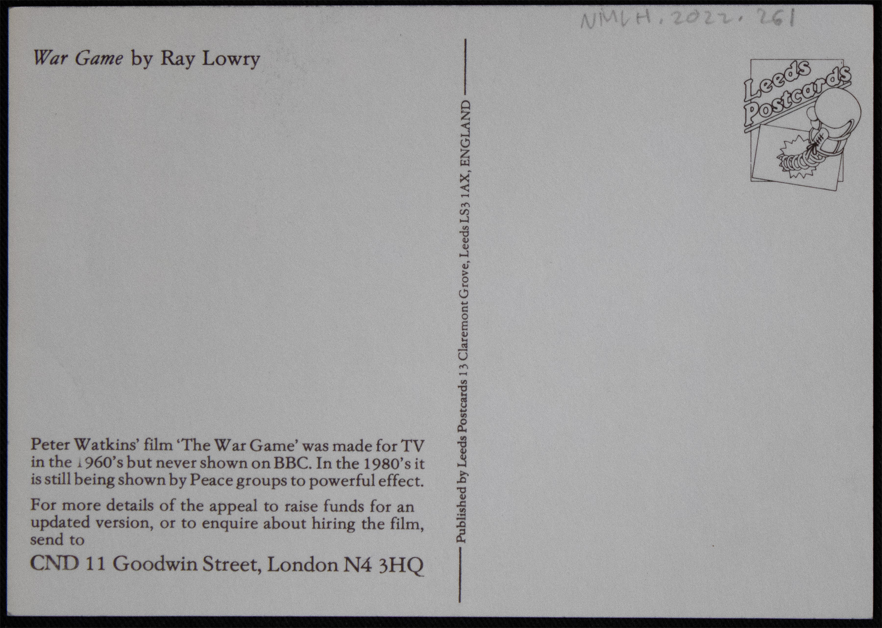On the left hand side of the postcard it reads "War Game by Ray Lowry. Peter Watkins' film 'The War Game' was made for TV in the 1960s but never shown on BBC. In the 1980's it is still being shown by Peace groups to powerful effect. For more details of the appeal to raise funds for an updated version, or to enquire about hiring the film, send to CND 11 Goodwin Street, London N4 3HQ." The War Game is a 1966 British documentary film that is about a nuclear war and its aftermath. This was written, directed and produced by Peter Watkins for the BBC. It caused controversy amongst the government and the BBC, and was withdrawn before the provisional screening date in 1965. The film eventually premiered at the National Film Theatre in London, on 13 April 1966, where it ran until 3 May. It was then shown abroad at several film festivals, including the Venice one where it won the Special Prize. It also won the Academy Award for Best Documentary Feature in 1967. The film was eventually televised