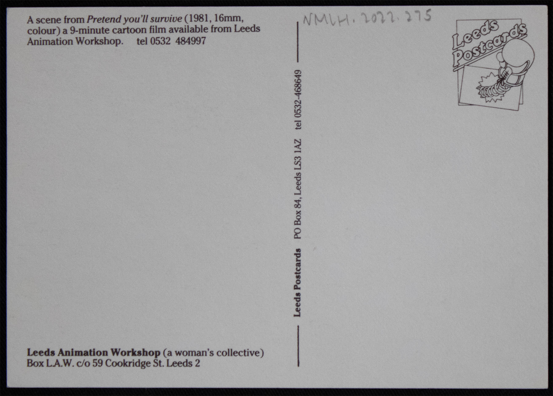 There is a Leeds postcard logo. Leeds Postcards was founded in 1979, with the intention of using postcards “as a political tool and agent for change”.