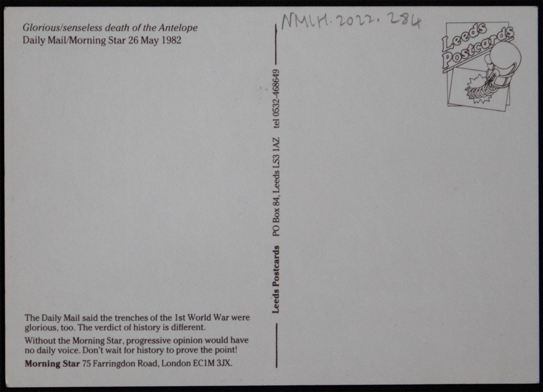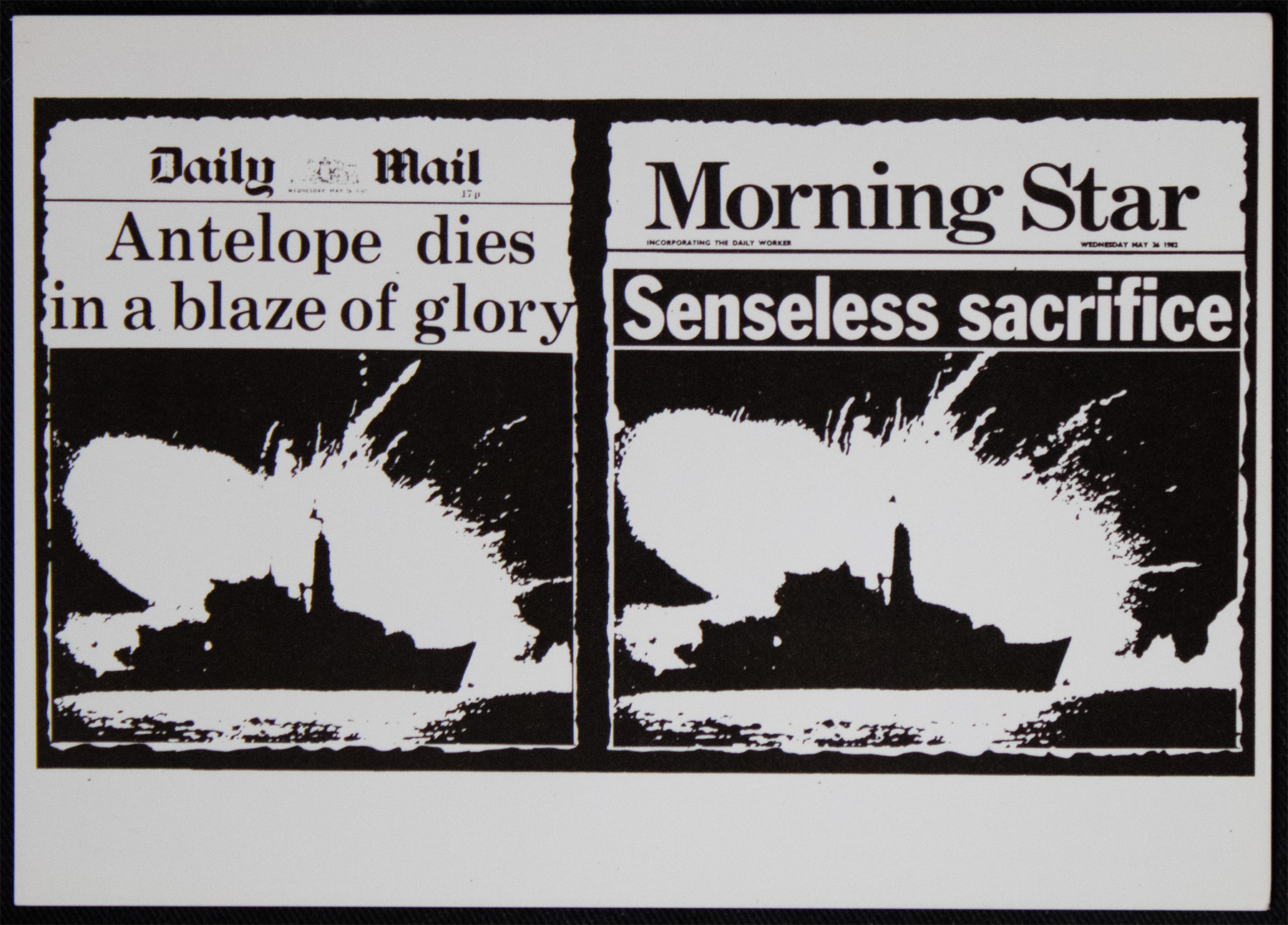 Postcard with two side by side newspaper frontcovers. These images are black white; the one of the left is the Daily Mail and says "Antelope dies in a blaze of glory." The other newspaper front cover says "Morning Star, Senseless sacrifice." Both newspapers show the same image of HMS antelope, a boat with an explosion behind it - this was a British Royal navy boat that participated in the Falklands war and was sunk by Argentine aircraft in 1982. This was bombed, and there were several casualties. The Daily Mail describes this with glory, whereas the morning star says it was a "senseless sacrifice." The reverse of the postcard has the publishing address and further infomation which reads "The Daily Mail said the trenches of the 1st World War were glorious, too. The verdict of history is different. Without the Morning Star, progressive opinion would have no daily voice. Don't wait for history to prove the point."