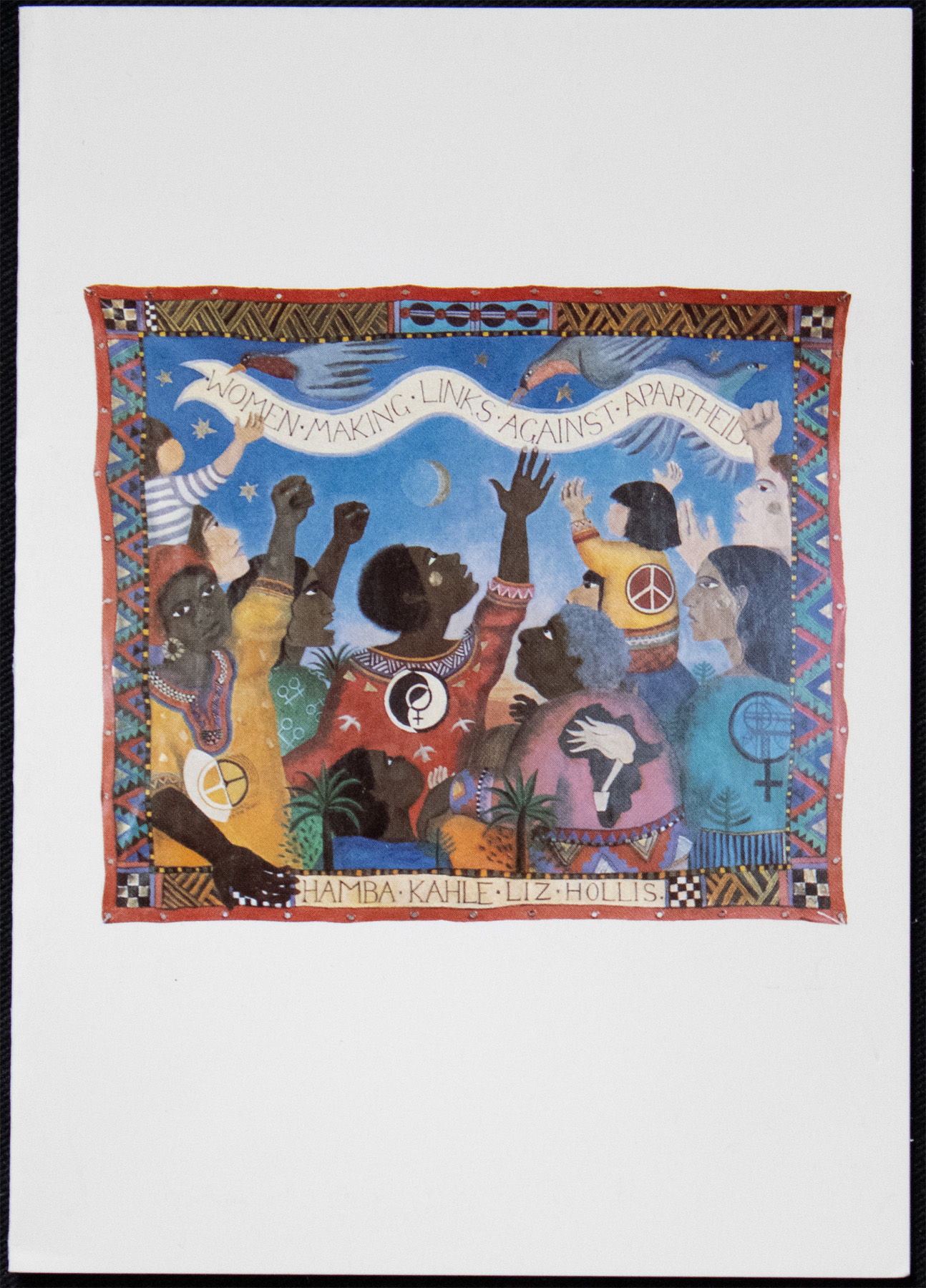 A postcard reproducing an image of a banner celebrating the role of women in the Anti-Apartheid Movement, London, around 1986. The banner features artwork of Black women with their hands and fists raised, wearing symbols on the back of their clothes, such as the venus symbol and the peace symbol. The banner was made to commemorate Liz Hollis, a young Anti-Apartheid Movement staff member who died tragically in 1986. Her name is written along the bottom along with the words "Hamba Kahle", meaning "Go in Peace" and is often used at someone's passing.