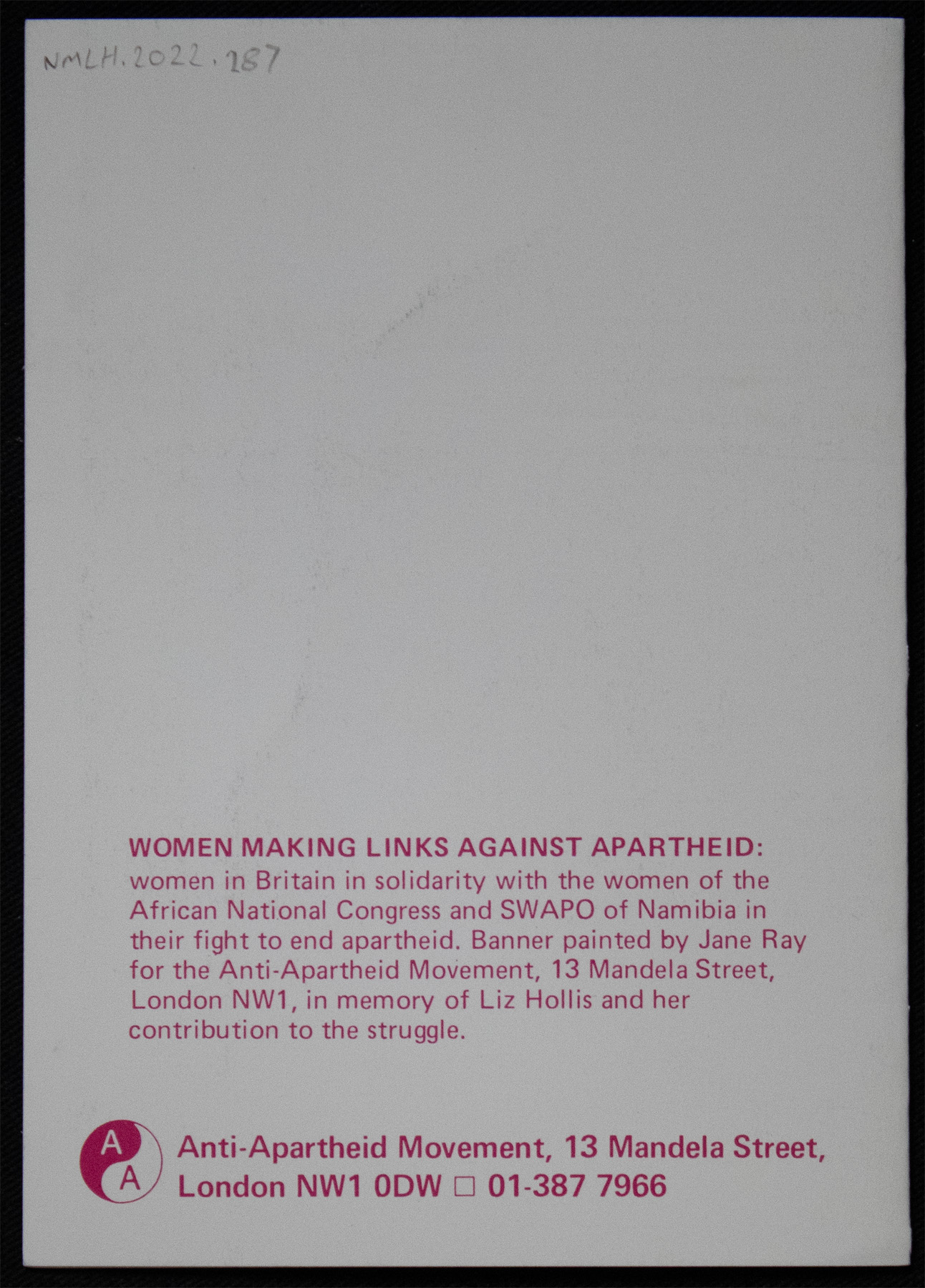 The back of the postcard reads: "WOMEN MAKING LINKS AGAINST APARTHEID: women in Britain in solidarity with the women of the African National Congress and SWAPO of Namibia in their fight to end Apartheid. Banner painted by Jane Rev for the Anti-Apartheid Movement, 13 Mandela Street, London NW1, in memory of Liz Hollis and her contribution to the struggle." in pink text