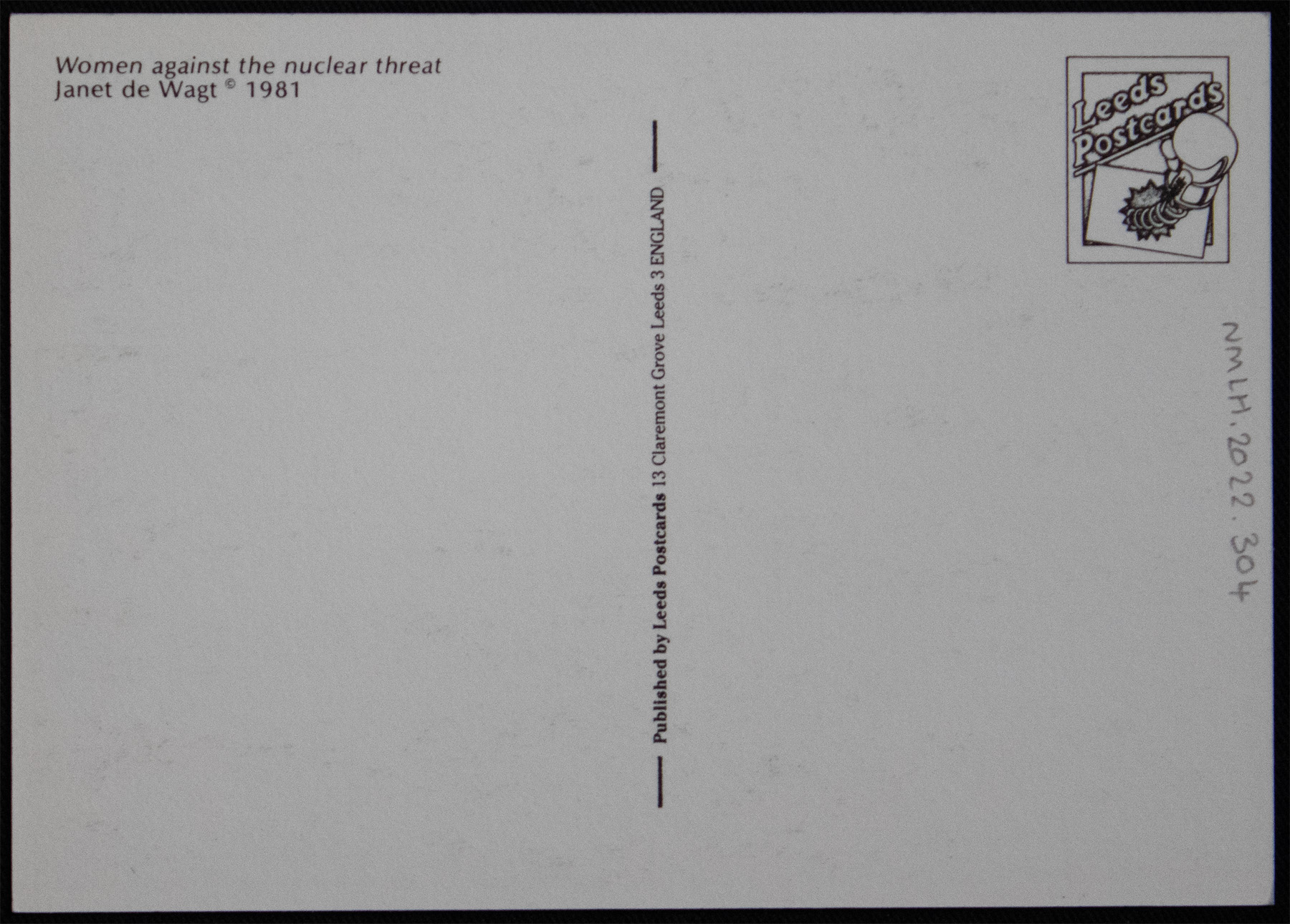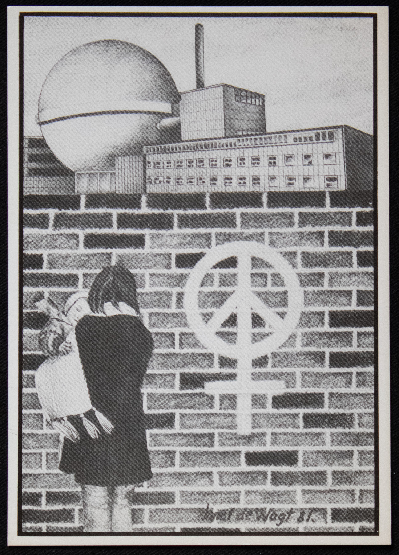 A black and white photograph of a sketch by Janet de Wagt, 1981. The sketch is titled "Women against the nuclear threat" and features a woman holding a young child facing towards what could be a weapons factory. The CND peace sign is painted on the wall but it has been merged with the Venus symbol. The back is blank.