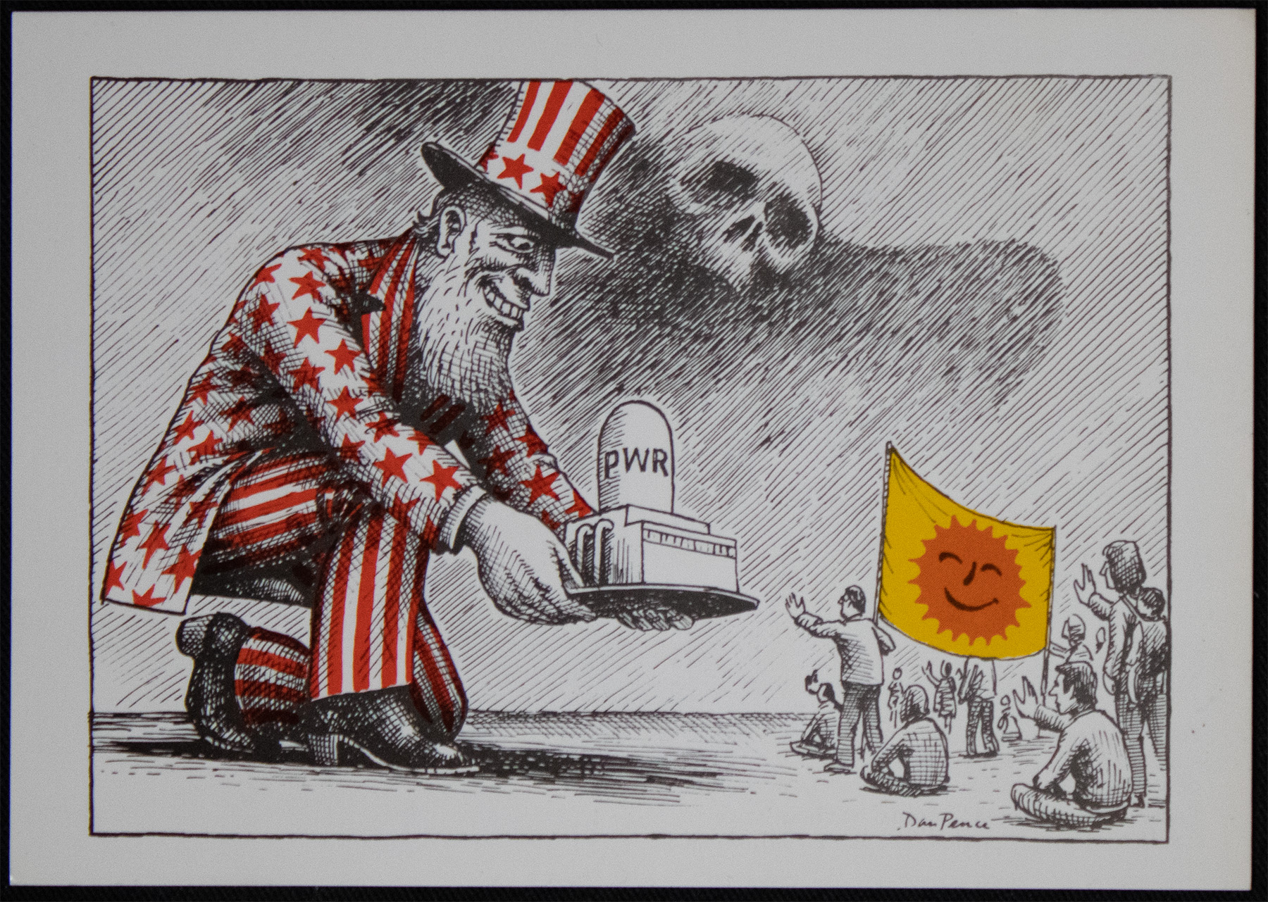A postcard featuring a design by Dan Pearce, titled "No thanks, Uncle Sam". In it, Uncle Sam, the personification of the USA often seen on military recruitment advertises, is smiling whilst handing down a nuclear power plant to a group of people on the ground. The group are holding their hands out in protest and are carrying a banner with a smiling sun, the international symbol of the anti-nuclear movement. A skull lurks in the sky above Uncle Sam. This postcard was made in response to the proposed development if Sizewell 'B', a nuclear energy reactor in East Anglia.