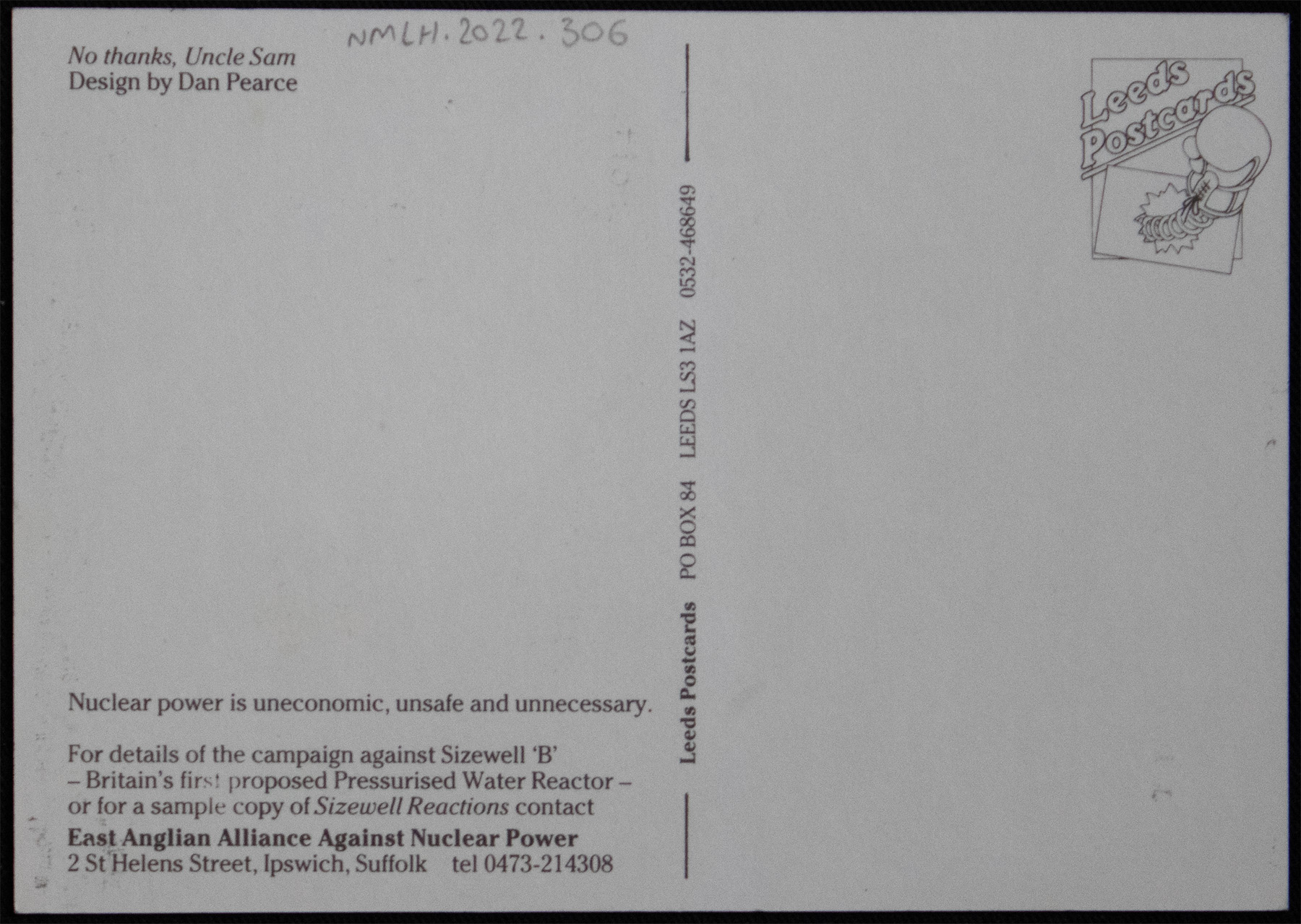 The back of the postcard reads: "Nuclear power is uneconomic, unsafe, and unnecessary. / For details of the campaign against Sizewell 'B'- Britain's first proposed Pressurised Water Reactor- or for a sample copy of Sizewell Reactions contact East Anglian Alliance Against Nuclear Power"