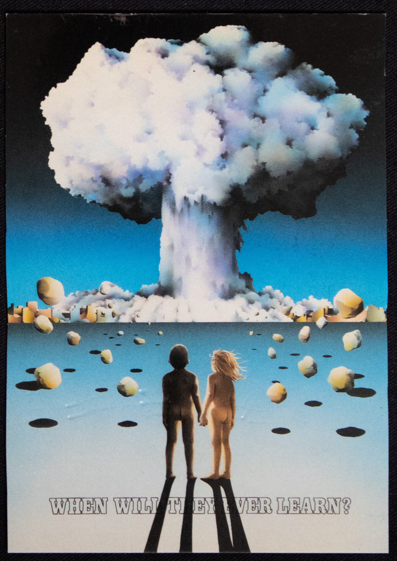A postcard featuring an image of a man and a woman stood in front of a mushroom cloud. They are reminiscent of Adam and Eve and are holding hands. The artwork was made by David Holmes and is titled "When will they ever learn?" A written inscription on the back of the postcard reads: "Women demand peace for the world"