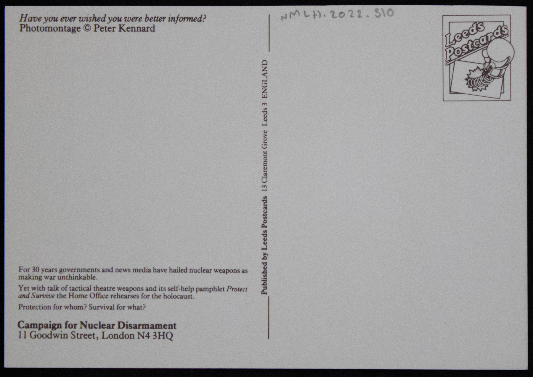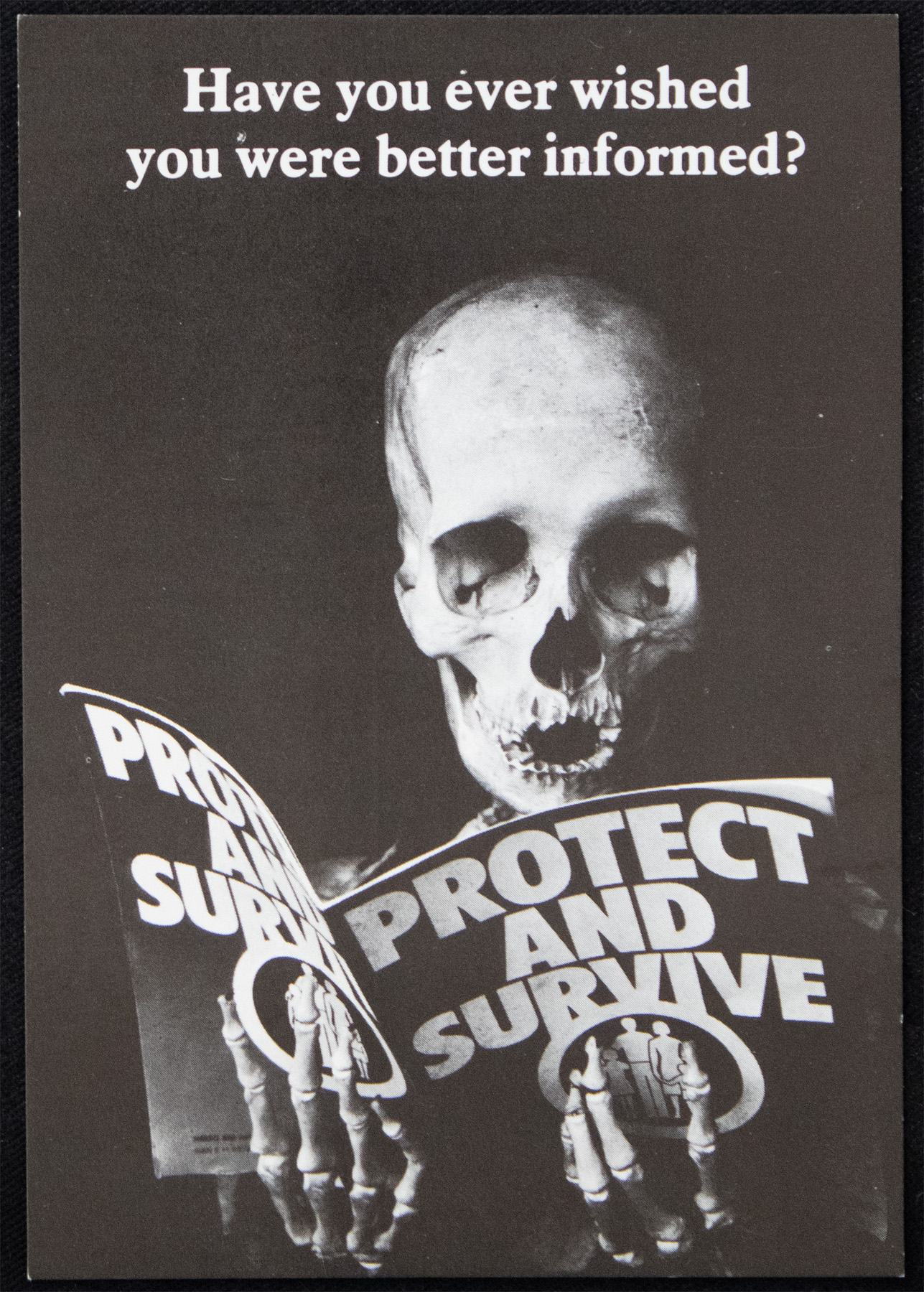 A small black postcard featuring an image of a skeleton reading a pamphlet entitled "Protect and survive" White text at the top reads: "Have you ever wished you were better informed?" The postcard was designed by Peter Kennard and published by the Campaign for Nuclear Disarmament (CND). Text on the back reads: "For 30 years governments and news media have hailed nuclear weapons as making war unthinkable. Yet with talk of tactical theatre weapons and its self-help pamphlet 'Protect and survive', the Home Office rehearses for the Holocaust. Protection for whom? Survival from what?"
