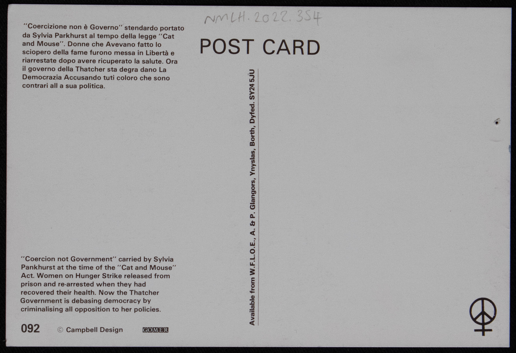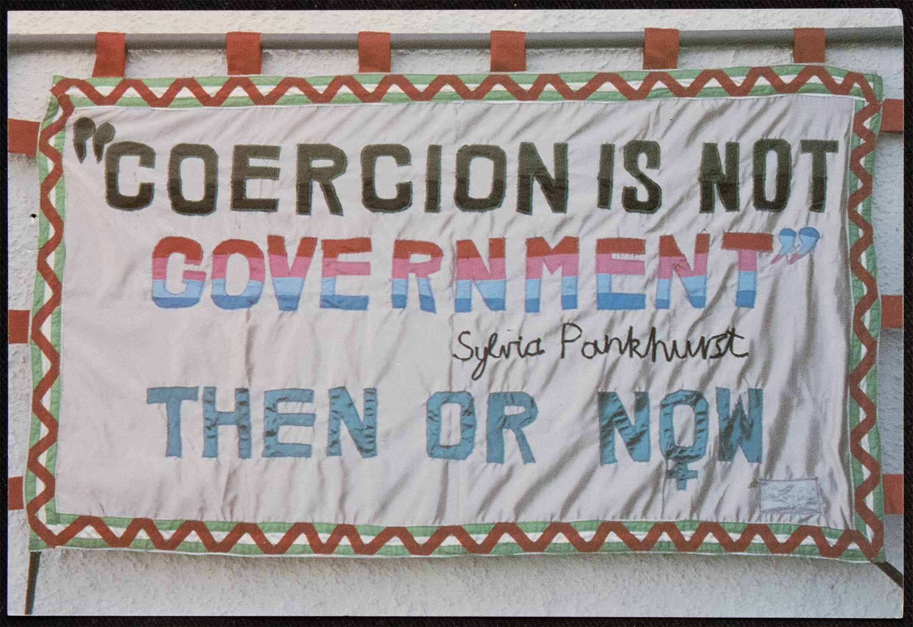 A postcard featuring a photograph of a banner which reads: "'Coercion is not government' -Sylvia Pankhurst / Then or Now" The banner was made by Thalia and Ian Campbell, 1985 and is in the collection of the Peace Museum, Bradford.