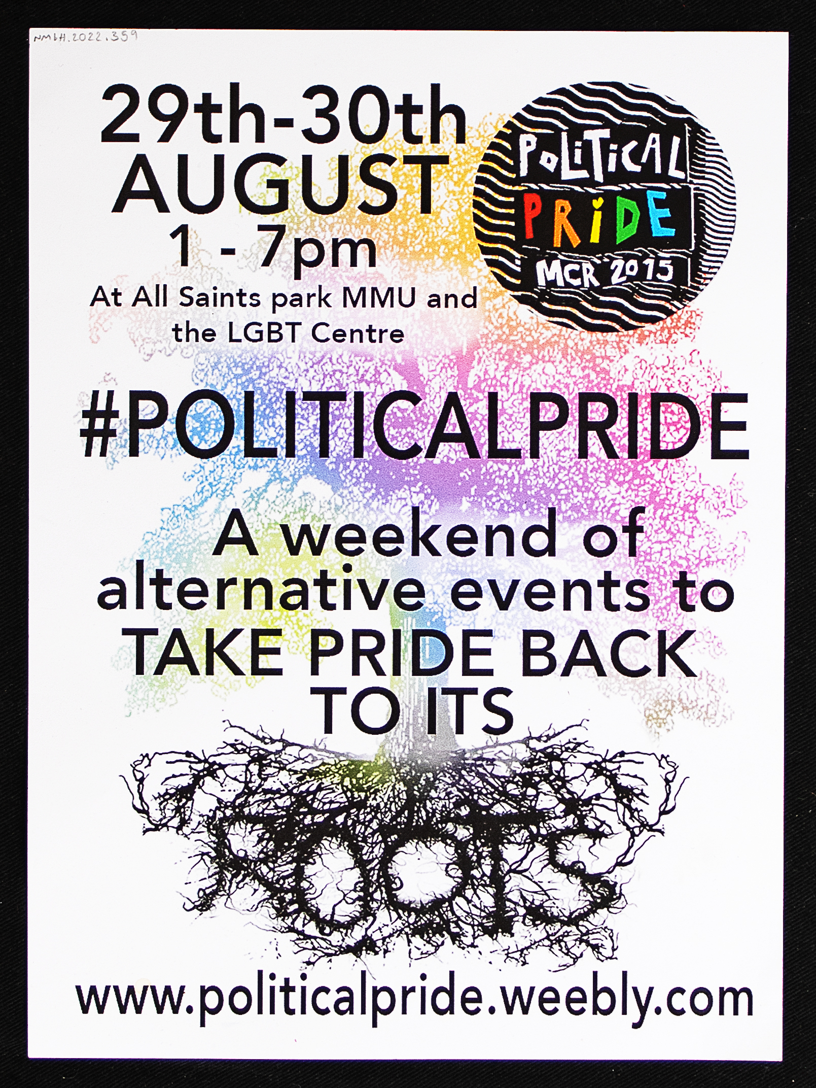 Political Pride Manchester was set up in August 2015 as an alternative to the Pride event set up by Manchester Pride following an open meeting by the LGBT Centre in Manchester to gauge the needs of the LGBT community in Manchester. Political Pride had around 40 core volunteers representing different activist groups around the city, and activities were hosted at the Sidney Street LGBT cafe as well as the Manchester Metropolitan University campus. The idea behind Political Pride was to take Pride back to its roots as a protest, using it as a tool for collective organising to further the rights of LGBT people. Central to the idea of Political Pride was providng an alternative space to the club and pub scene of the Gay Village in order to attract a wider representation of the LGBT+ population and emphasise that Pride is about more than partying.