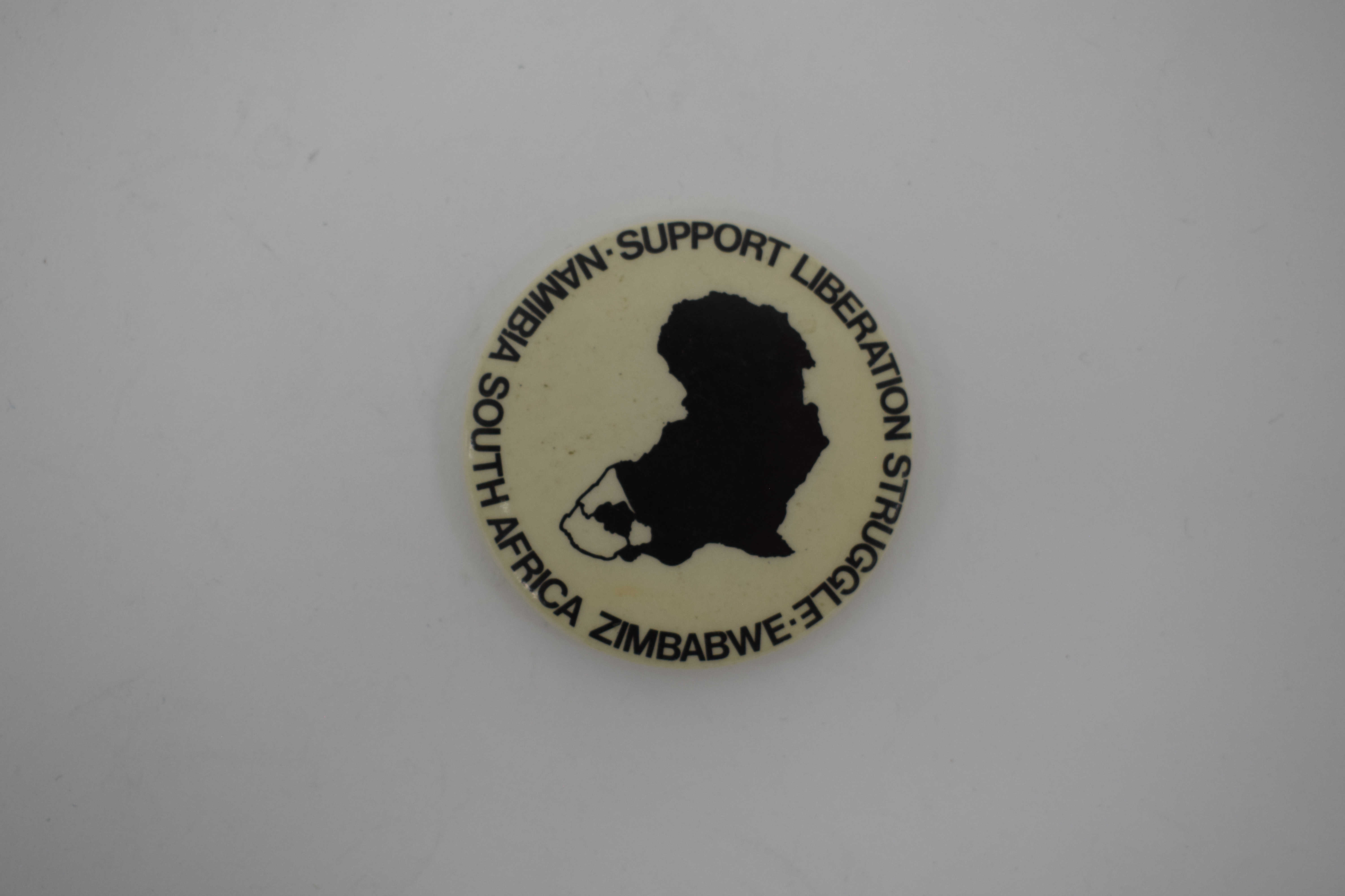 White badge, reading "Support Liberation Struggle" along the top edge, and "Namibia South Africa Zimbabwe" along the bottom edge. In the centre is a drawing of Africa all in black, with the three countries mentioned coloured white with black outlines.