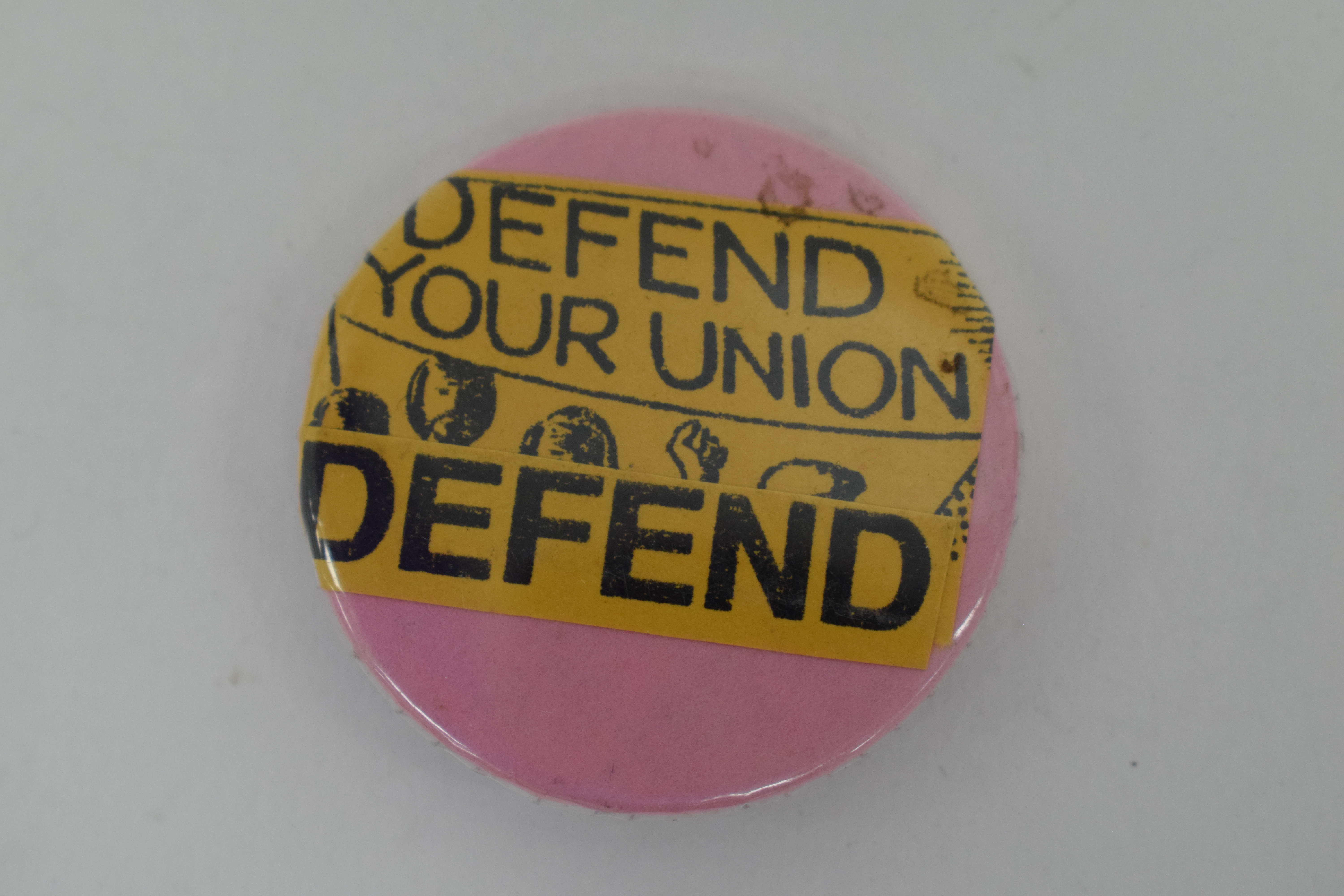 Pink badge with a yellow central line, reading "Defend" in black letters. Above is an image of a banner being carried reading "Defend Your Union". Between the banner and the central yellow section is a raised fist and several faces.