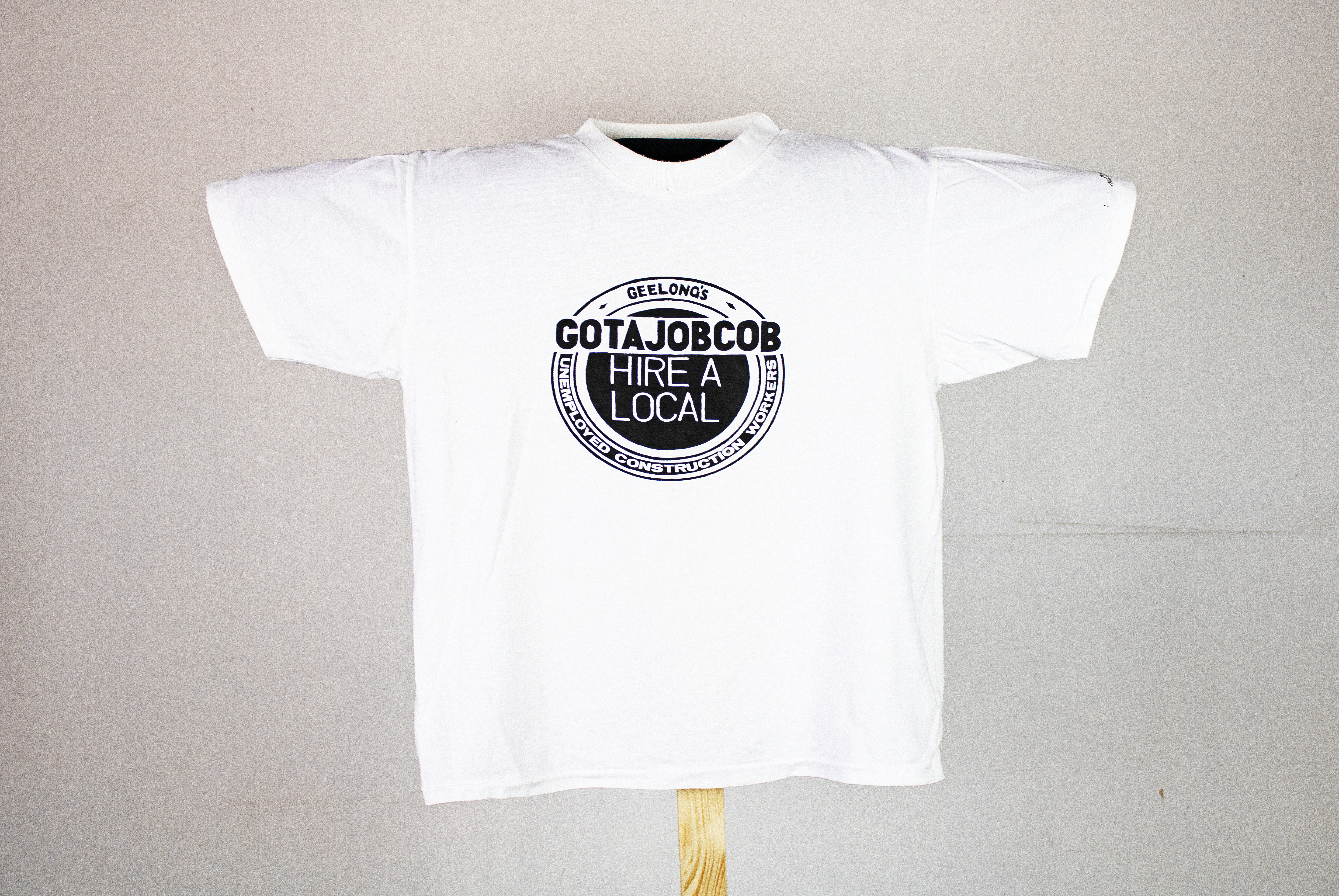 A white t-shirt reading "Geelong's GOT A JOB? HIRE A LOCAL! Unemployed construction workers"