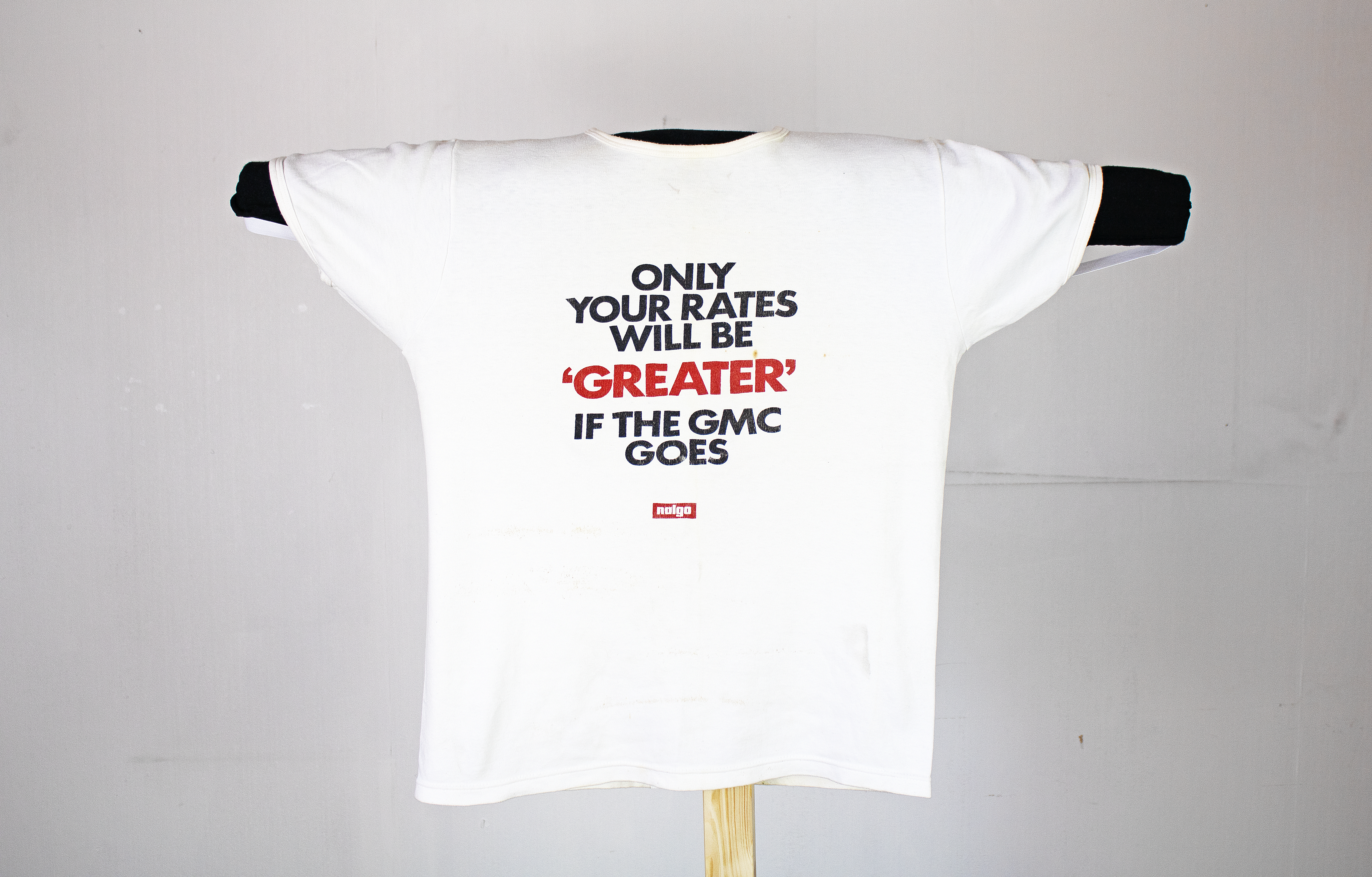 A white t-shirt with black and red text reading "ONLY YOUR RATES WILL BE 'GREATER' IF THE GMC GOES", produced by NALGO as part of a campaign to save the GMC