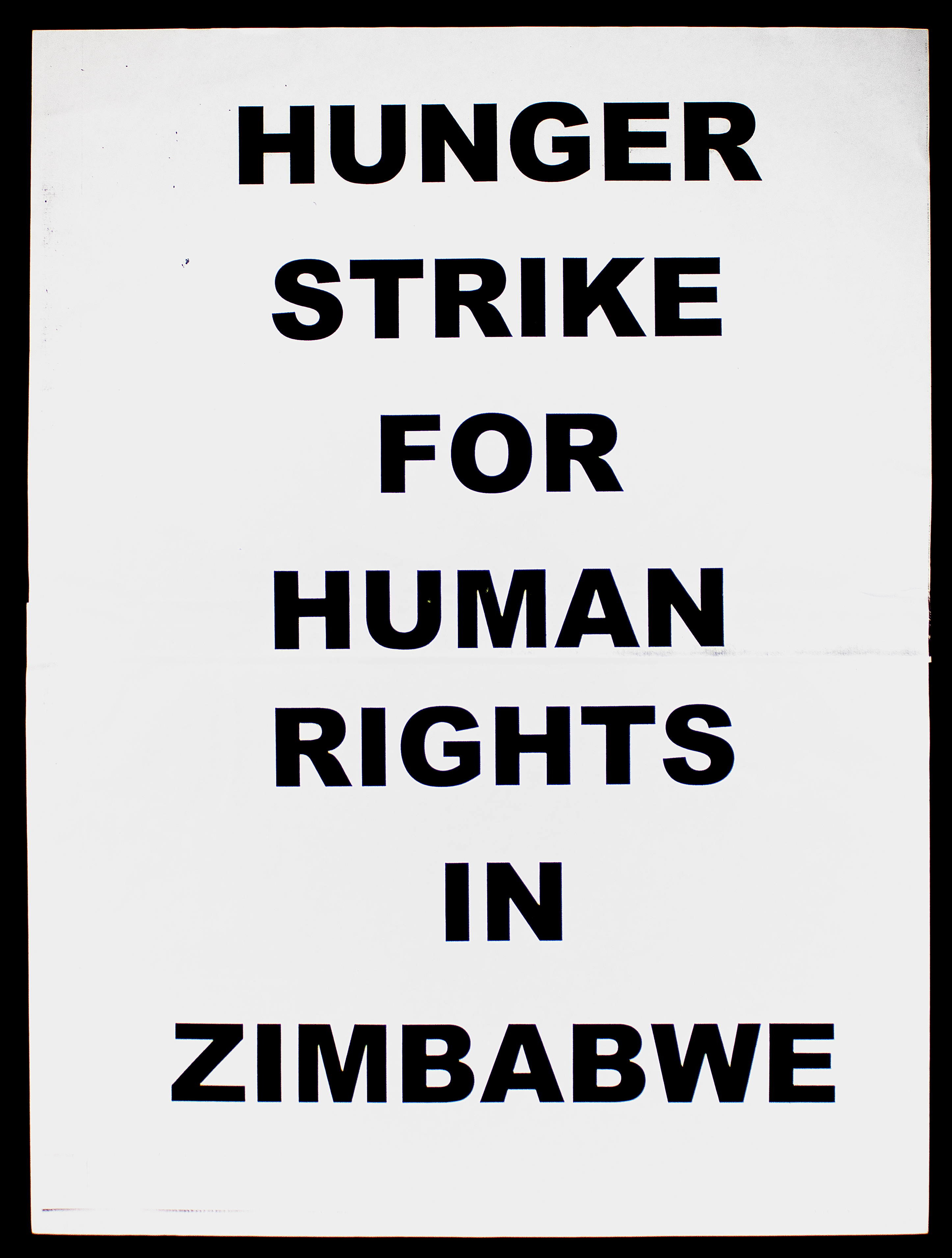 OutRage! was a queer direct action group formed in May 1990 and active until 2011. Its aims were to assert the human rights of LGBTQIA people; to fight homophobia, discrimination and violence; and to affirm rights to sexual freedom and self-determination. This is a plain white poster with black text reading "Hunger strike for human rights in Zimbabwe" The OutRage! logo is at the bottom of the poster.