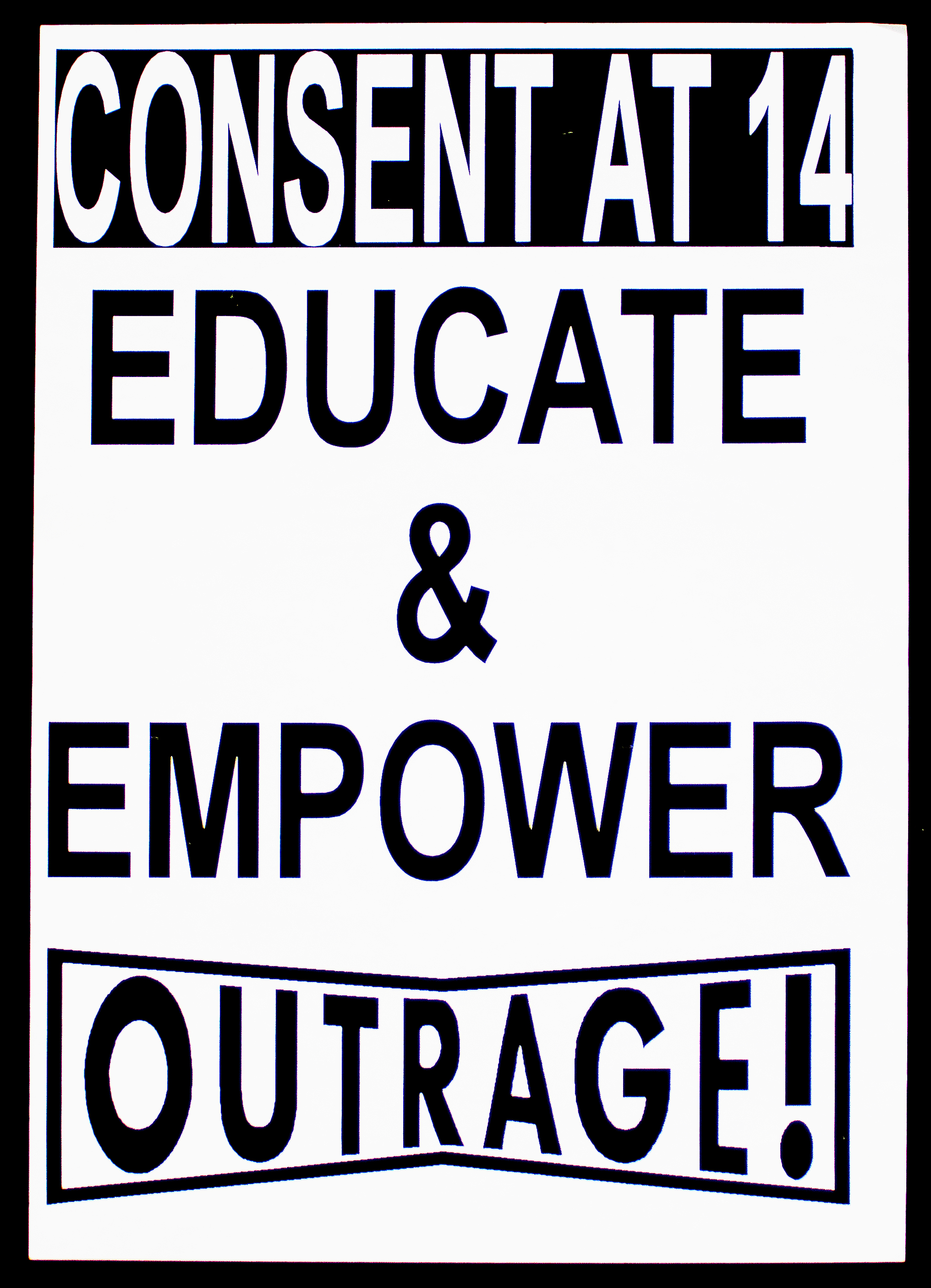 OutRage! was a queer direct action group formed in May 1990 and active until 2011. Its aims were to assert the human rights of LGBTQIA people; to fight homophobia, discrimination and violence; and to affirm rights to sexual freedom and self-determination. This is a plain white poster with black text reading "Consent at 14 / Educate and Empower" The OutRage! logo is at the bottom of the poster.