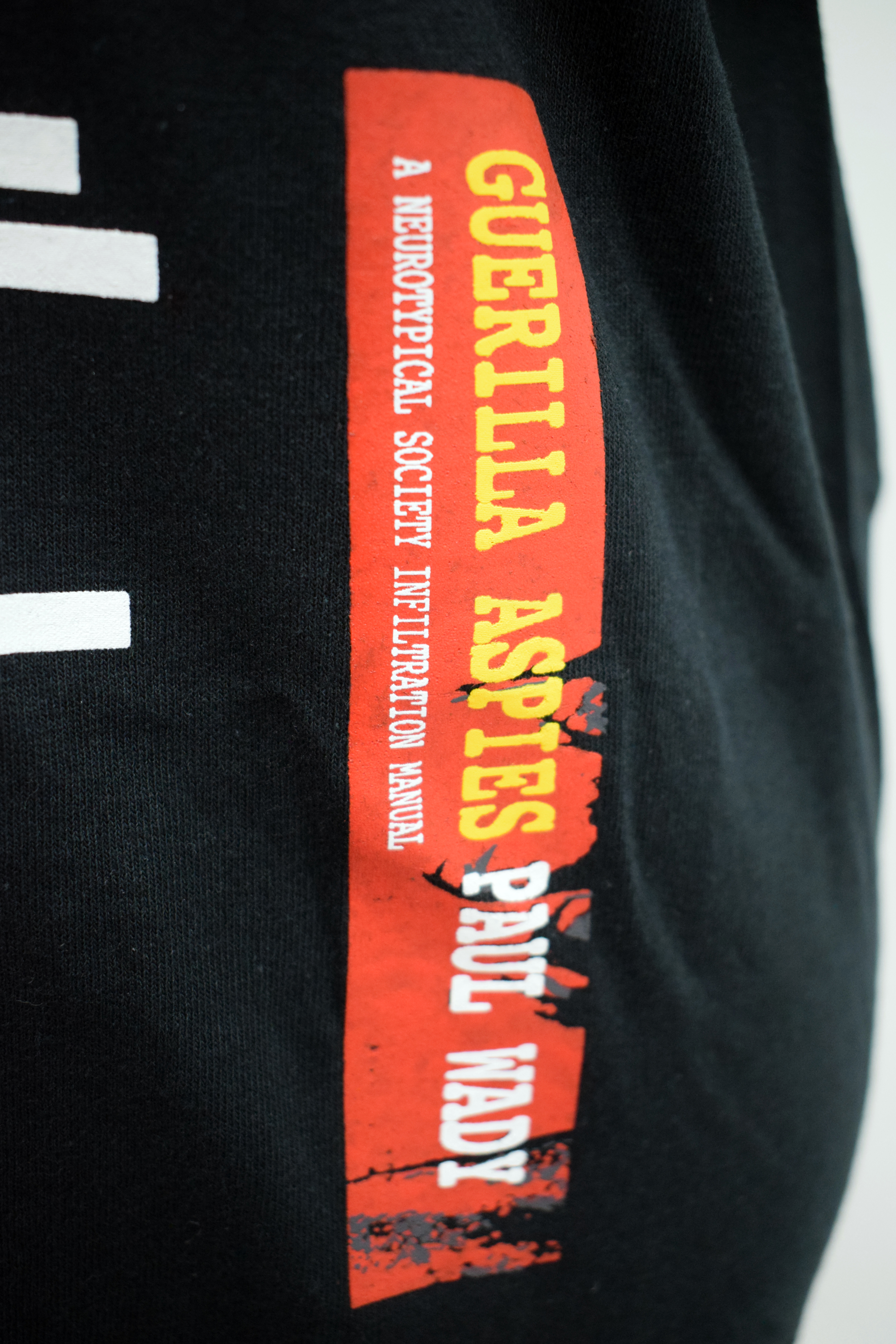 A black t-shirt with white writing 'I scare neurotypical people' with a red printed brand label on the bottom left side of the shirt in yellow and white text saying, 'Guerilla Aspies. Paul Wady. A Neurotypical Society Infiltration Manual'.