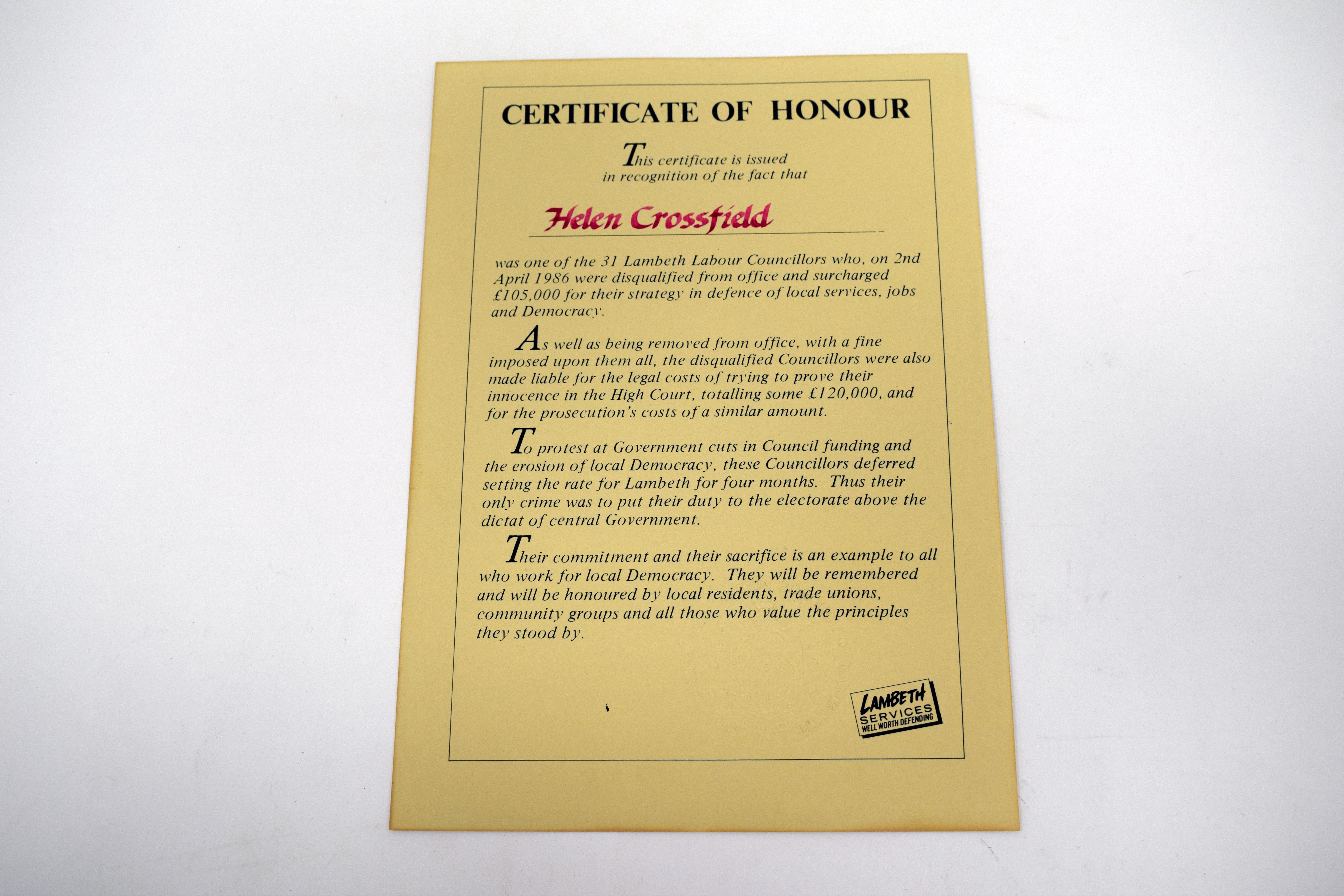 A yellow certificate with black text. It begins 'Certificate of Honour. This certificate is issued in recognition of the fact that Helen Crossfield was one of the 31 Lambeth Labour Councillors who, on 2nd April 1986 were disqualified from office and surcharged £105,000 for their strategy in defence of local services, jobs and Democracy.'