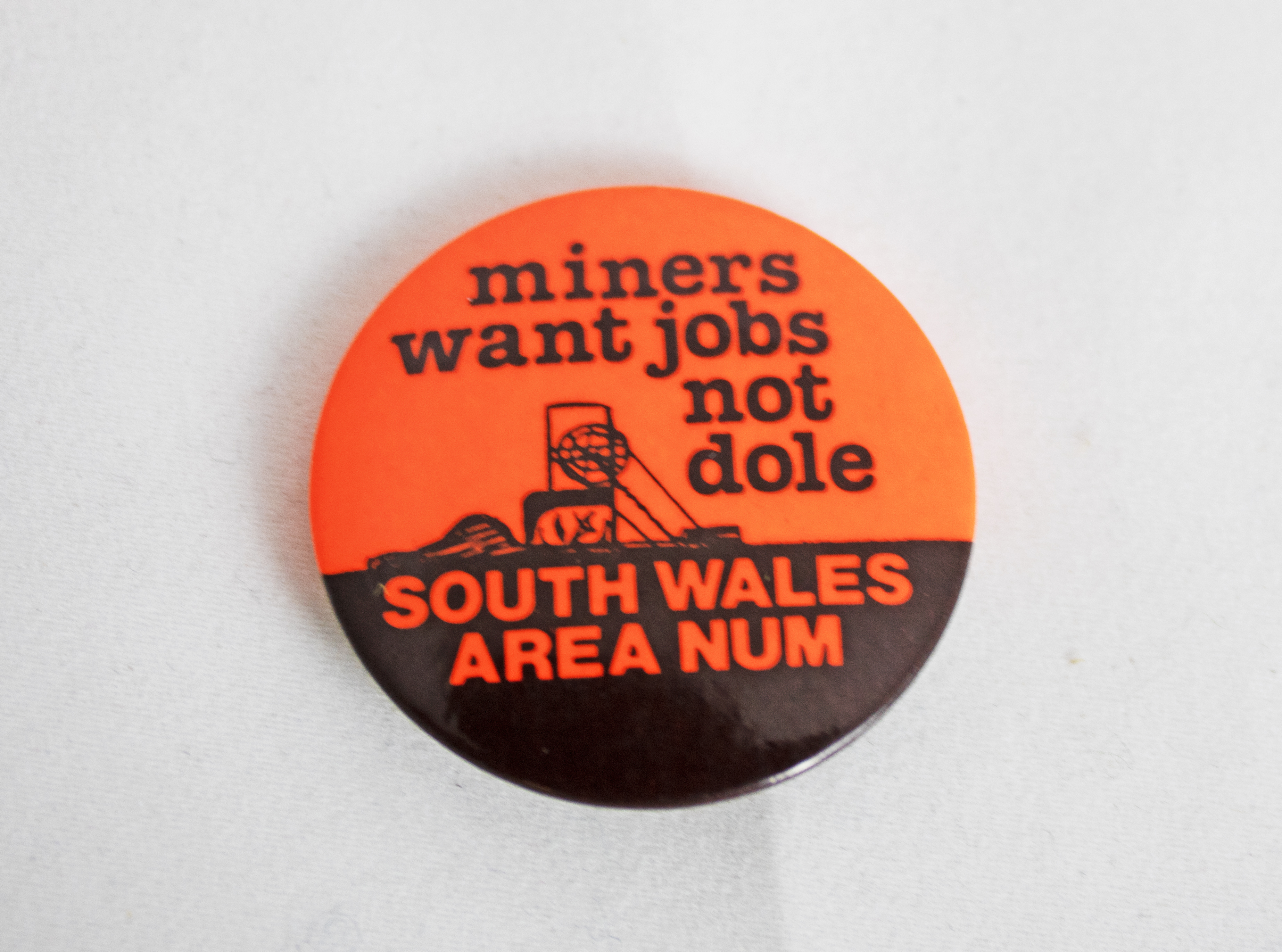 An orange plastic badge with a pin fastening. Text on the badge reads "Miners want jobs not dole / South Wales Area NUM [National Union of Mineworkers]" alongisde a depcition of a coalfield.