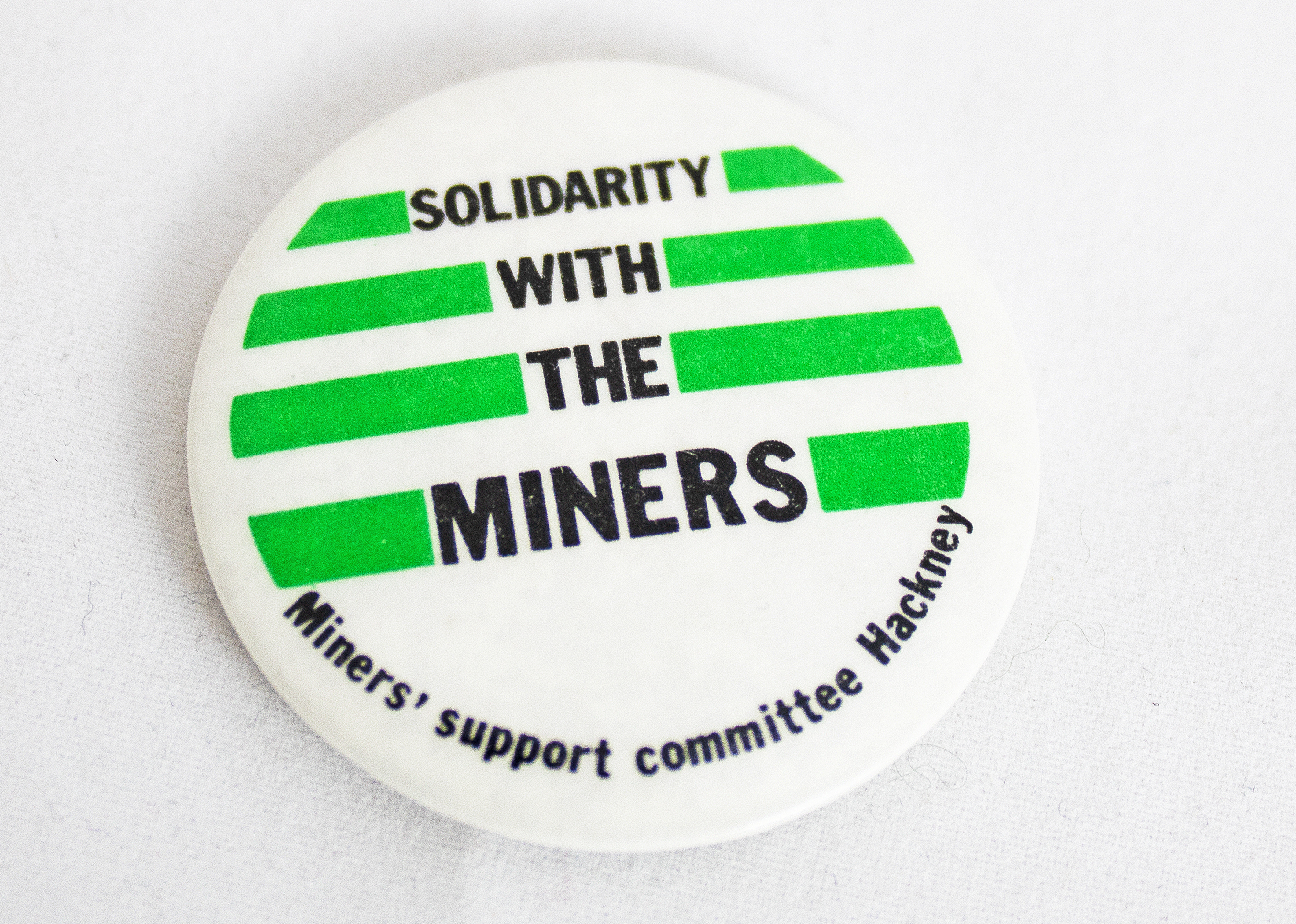 A plastic badge with a pin fastening. Text reads "Solidarity with the miners / Miners support committee Hackney"
