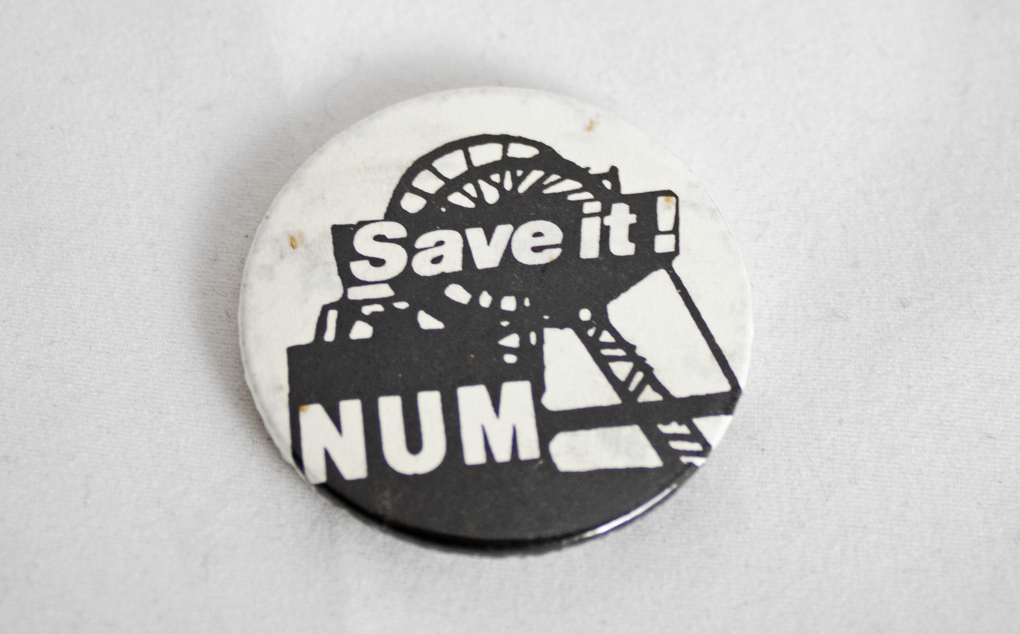 Round white badge depicting a pithead and reads "Save it! NUM [National Union of Mineworkers]" in large white letters on black.