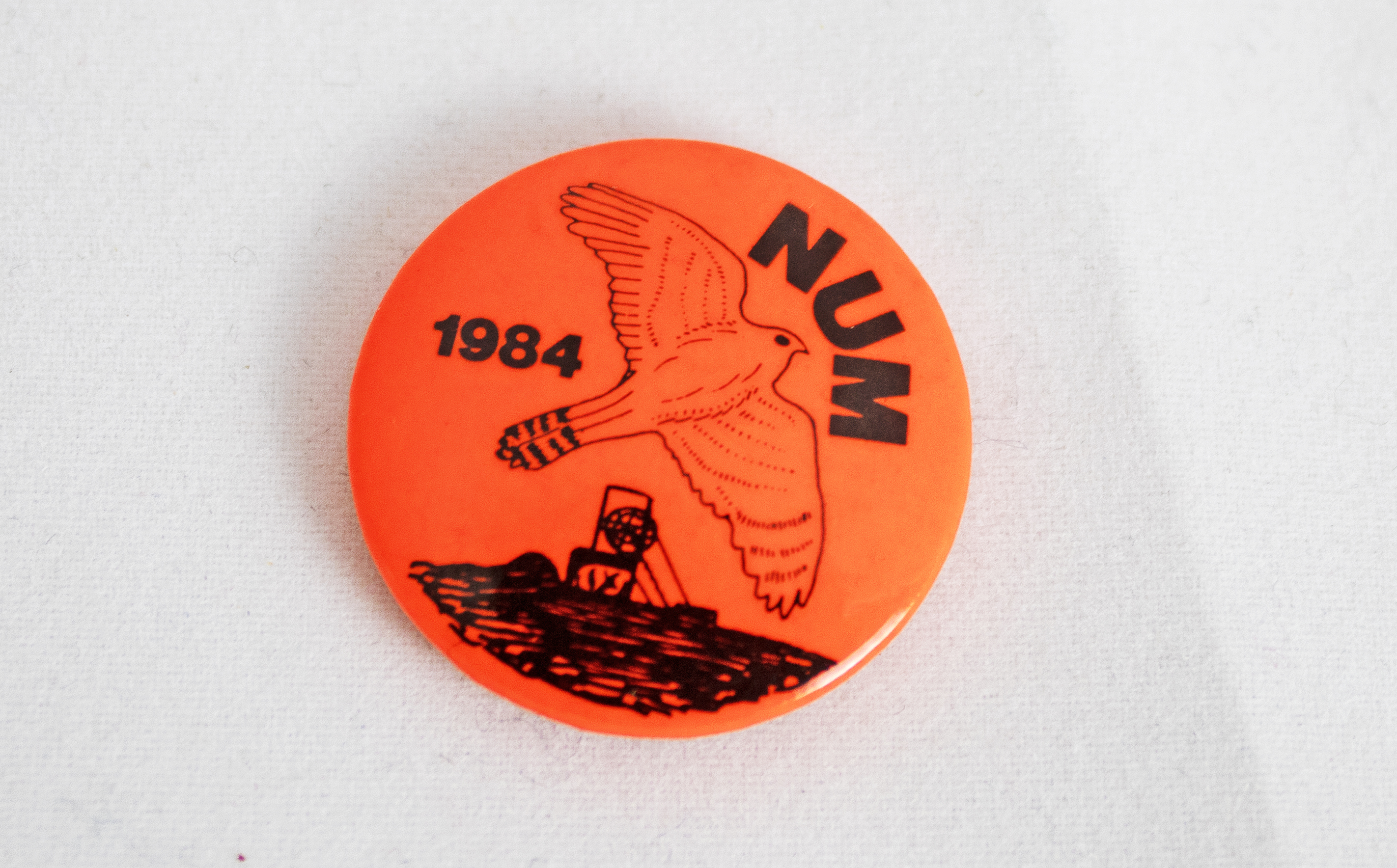 A small red plastic badge with a pin fastening. The badge reads "NUM [National Union of Mineworkers] 1984" in black text. The badge features the dove of peace flying over a pithead.