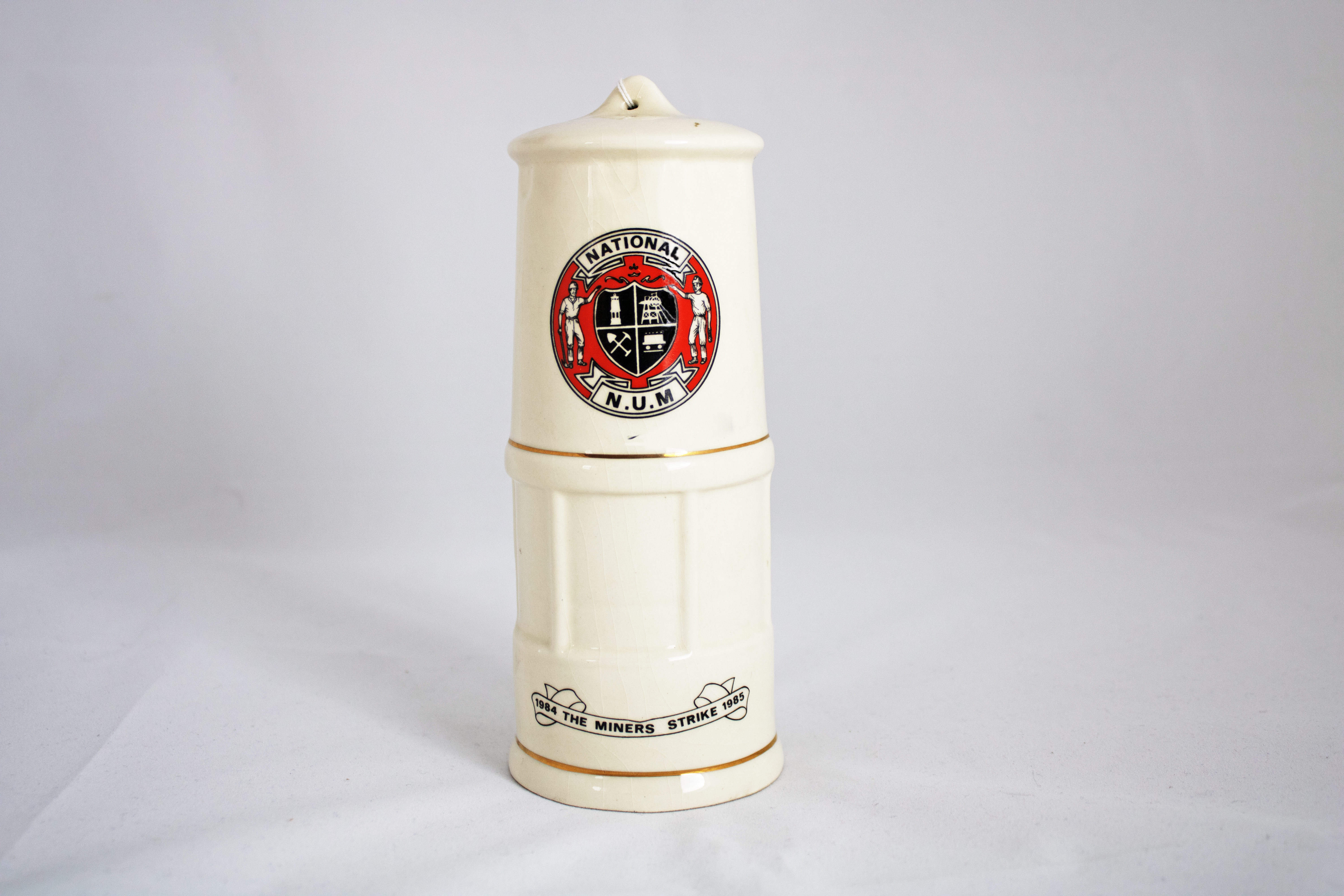 A white ceramic miner's lamp with the National Union of Mineworkers (NUM) logo and text reading 'National N.U.M / 1984 The Miners Strike 1985' The back of the mug features the signatures of Arthur Scargill, Mick McCarthy, and Peter Heathfield- president, vice president, and secretary of the NUM during the strike.