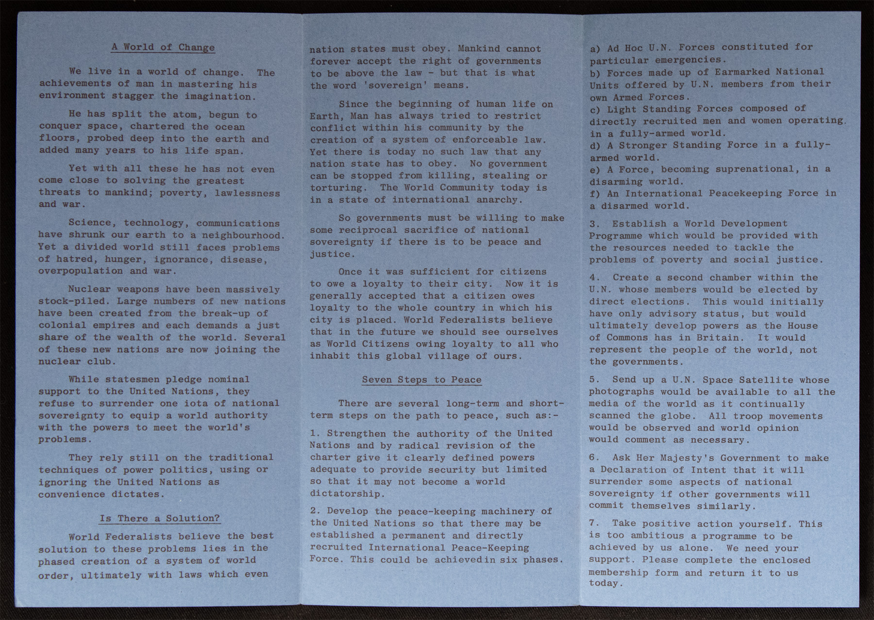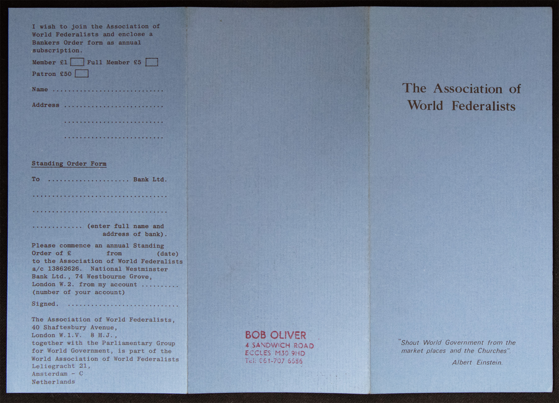 Blue tri-fold leaflet titled "The Association of World Federalists". The World Federalists campaigned for an international democracy with laws for nations, in an effort to prevent nuclear war and stockpiling.