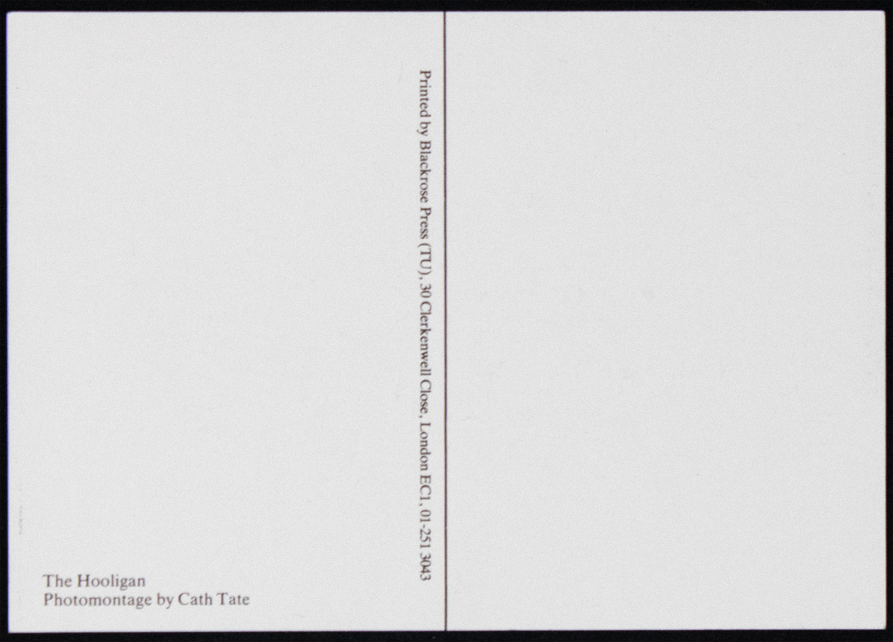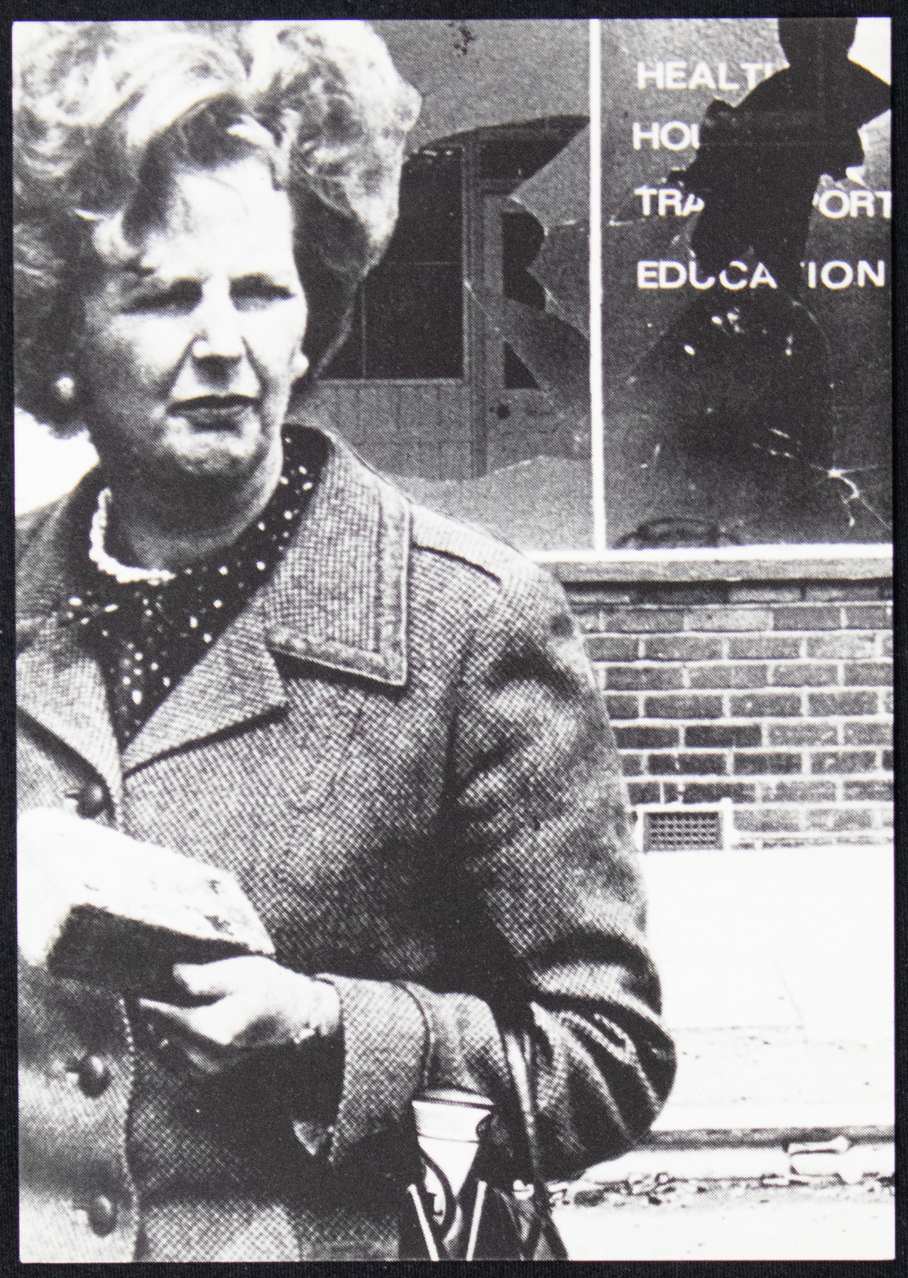 Postcard featuring a photomontaged image by Cath Tate of Prime Minister Margaret Thatcher holding a brick, while in the background is a shopfront with broken windows. Part of the shattered window reads "HEALTH...HOU[SIN]G...TRA[NSP]ORT....EDUCA[T]ION" with letters missing where the glass is smashed. Produced during the Anti-Poll Tax campaigns circa 1990.