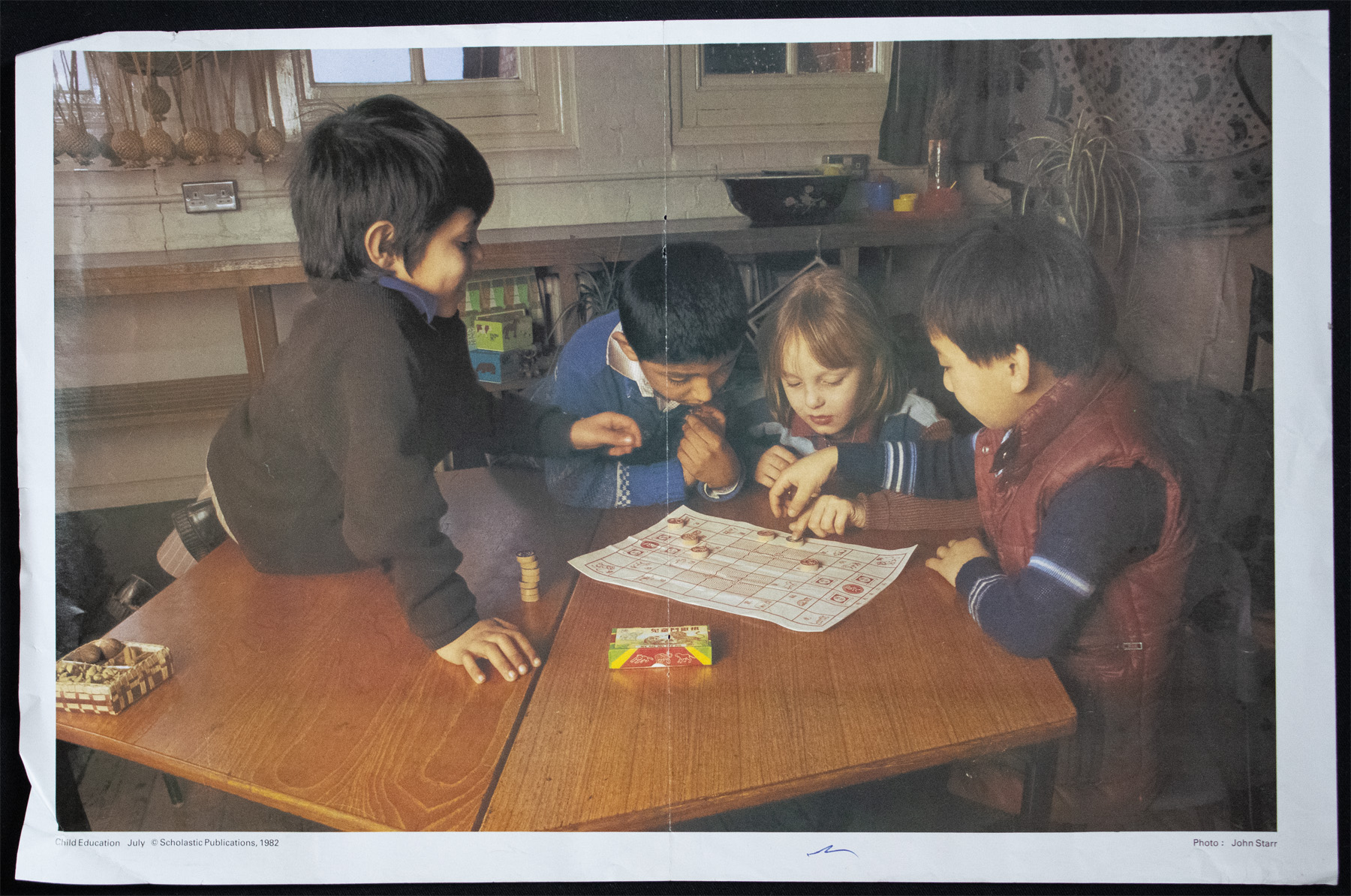 Poster with a photograph of a group of four children playing a board-based game with checkers.