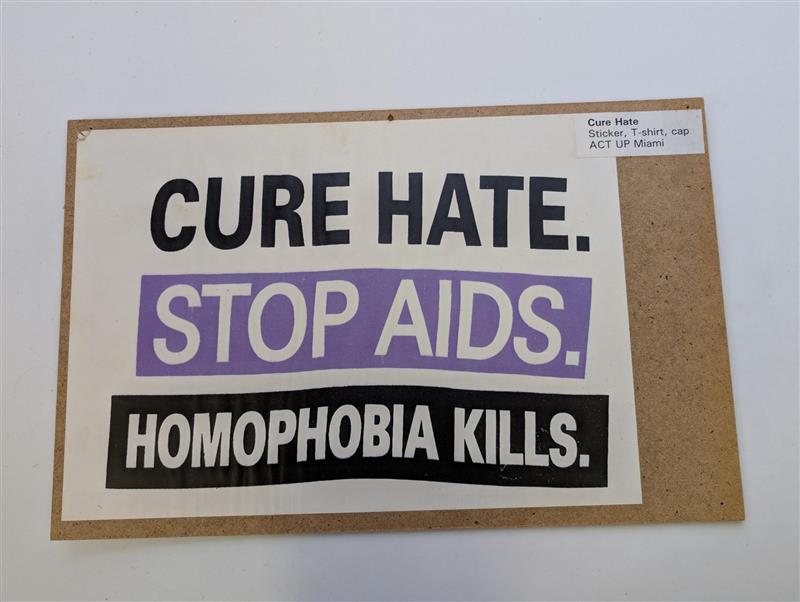 'Cure hate. Stop AIDS. Homophobia kills. Sticker, T-shirt, cap. ACT UP Miami'