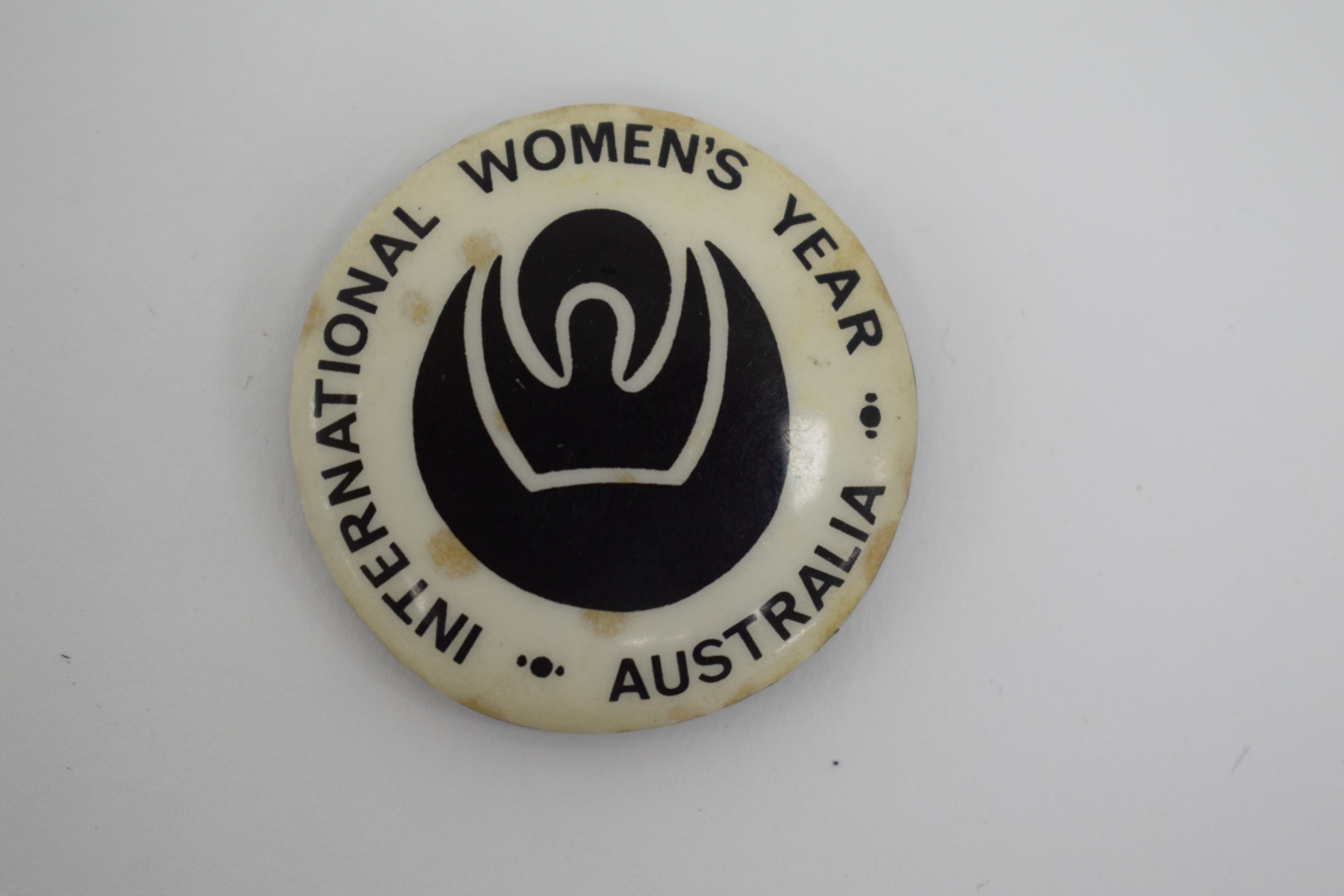 Round white badge, "International Women's Year - Australia" in black text and stylised image of a woman with raised arms in the centre. This badge was created for the International Women's Year (IWY) in 1975.