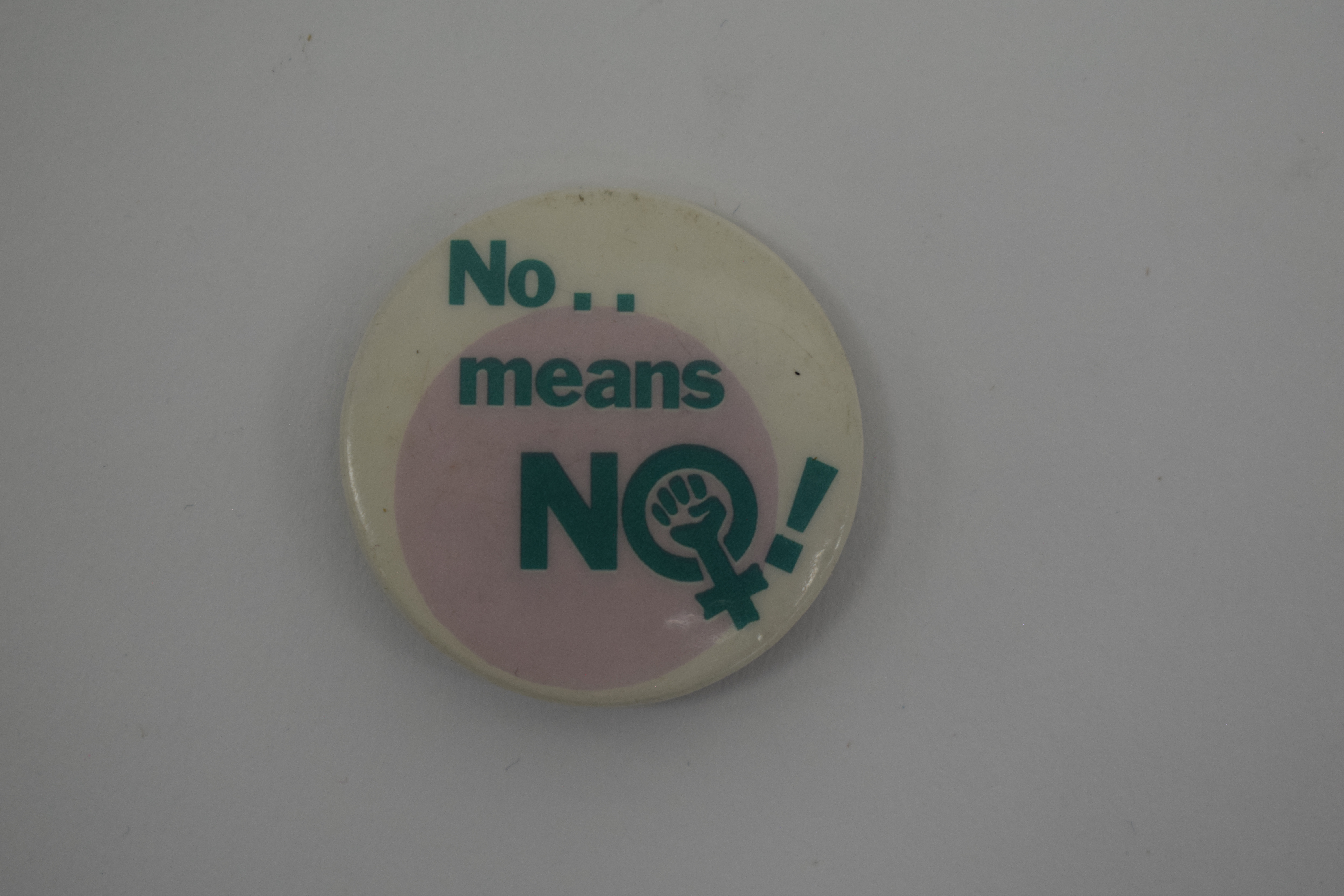 Round white badge with green text "No Means No!" and a combined logo of Venus symbol (?) and raised fist. "No Means No" is a well-known anti-rape slogan that emphasises the importance of respecting boundaries and consent.