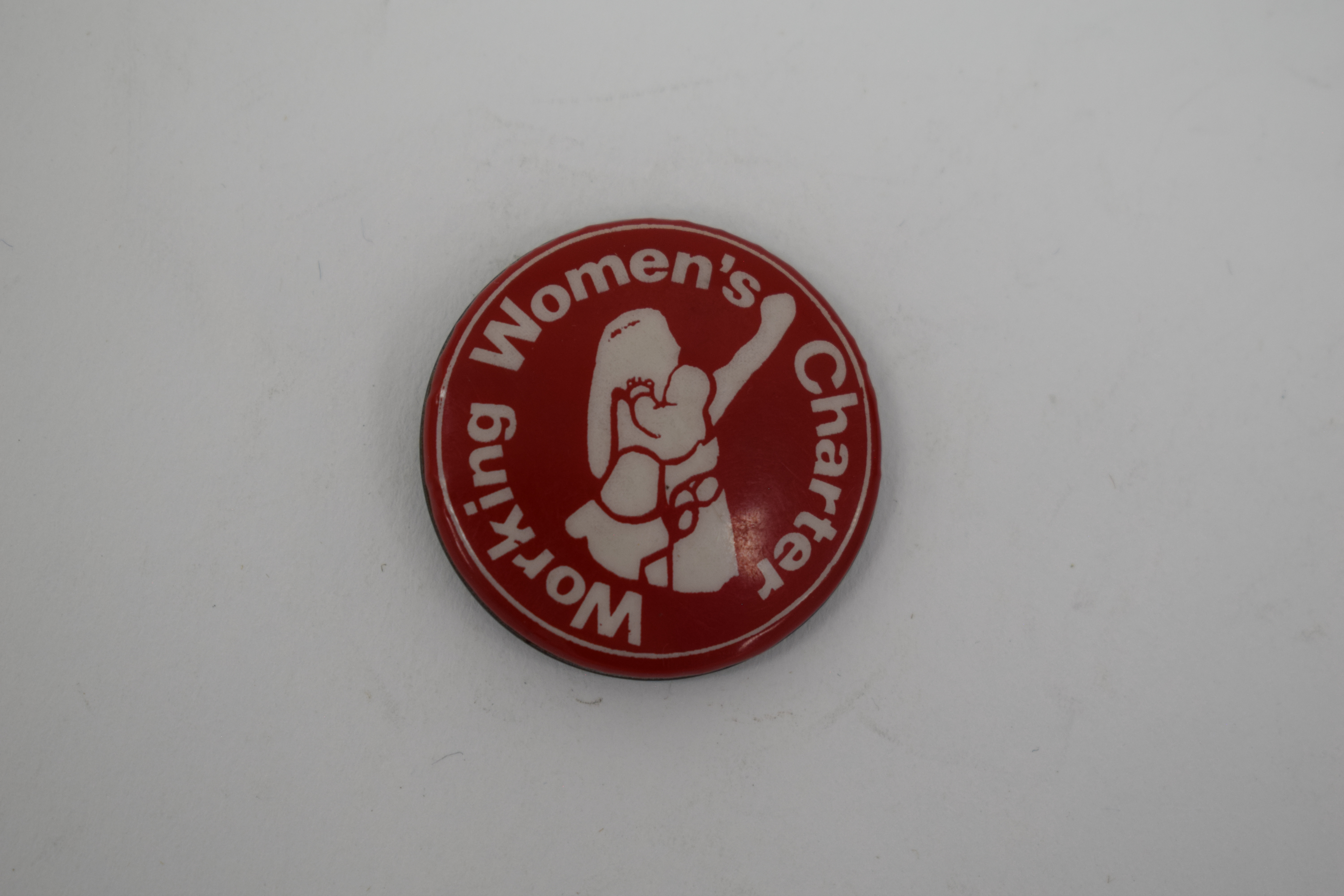 Brown circular badge, "Working Women's Charter" in white around the edge. In the centre is a stylised illustration of a woman holding a baby and with a small child at their side.