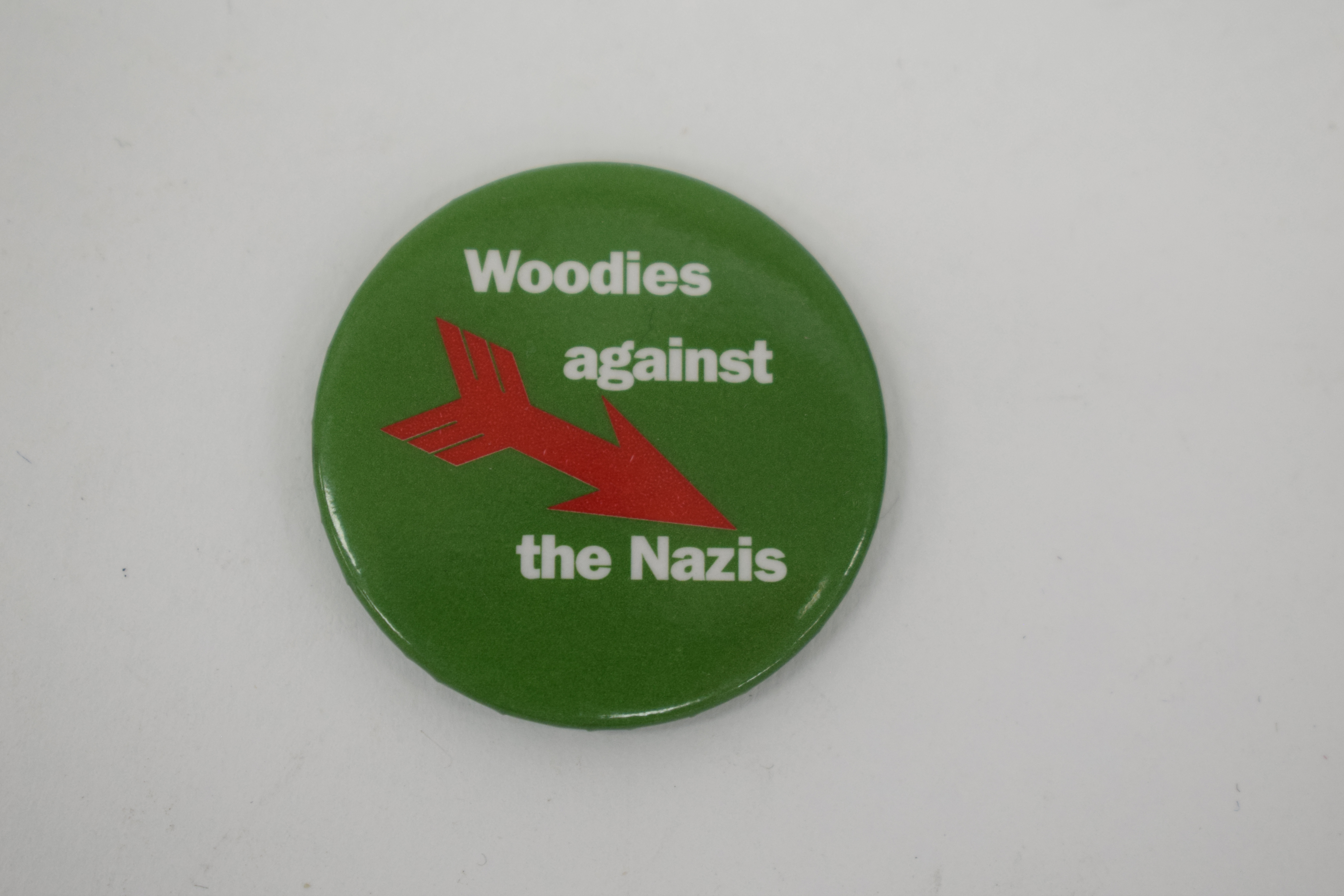 Round green badge, "Woodies against the Nazis" beside the red arrow logo of the Anti Nazi League (ANL).