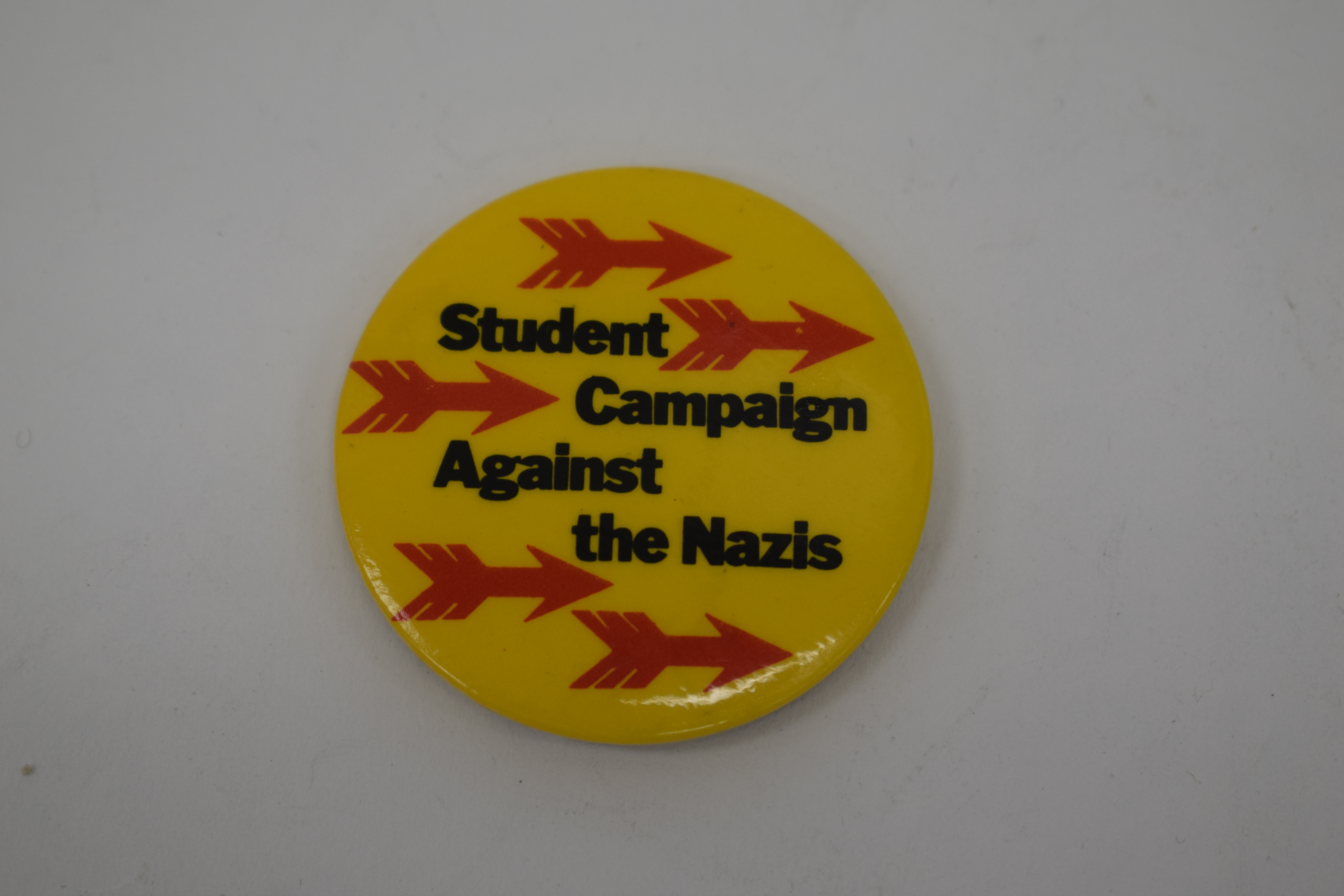Round yellow badge, "Student Campaign Against the Nazis" in black text with five red arrows pointing to the right. This badge was created for the student branch of the Anti-Nazi League (ANL), aimed at fighting neo-Nazi and fascist ideologies.