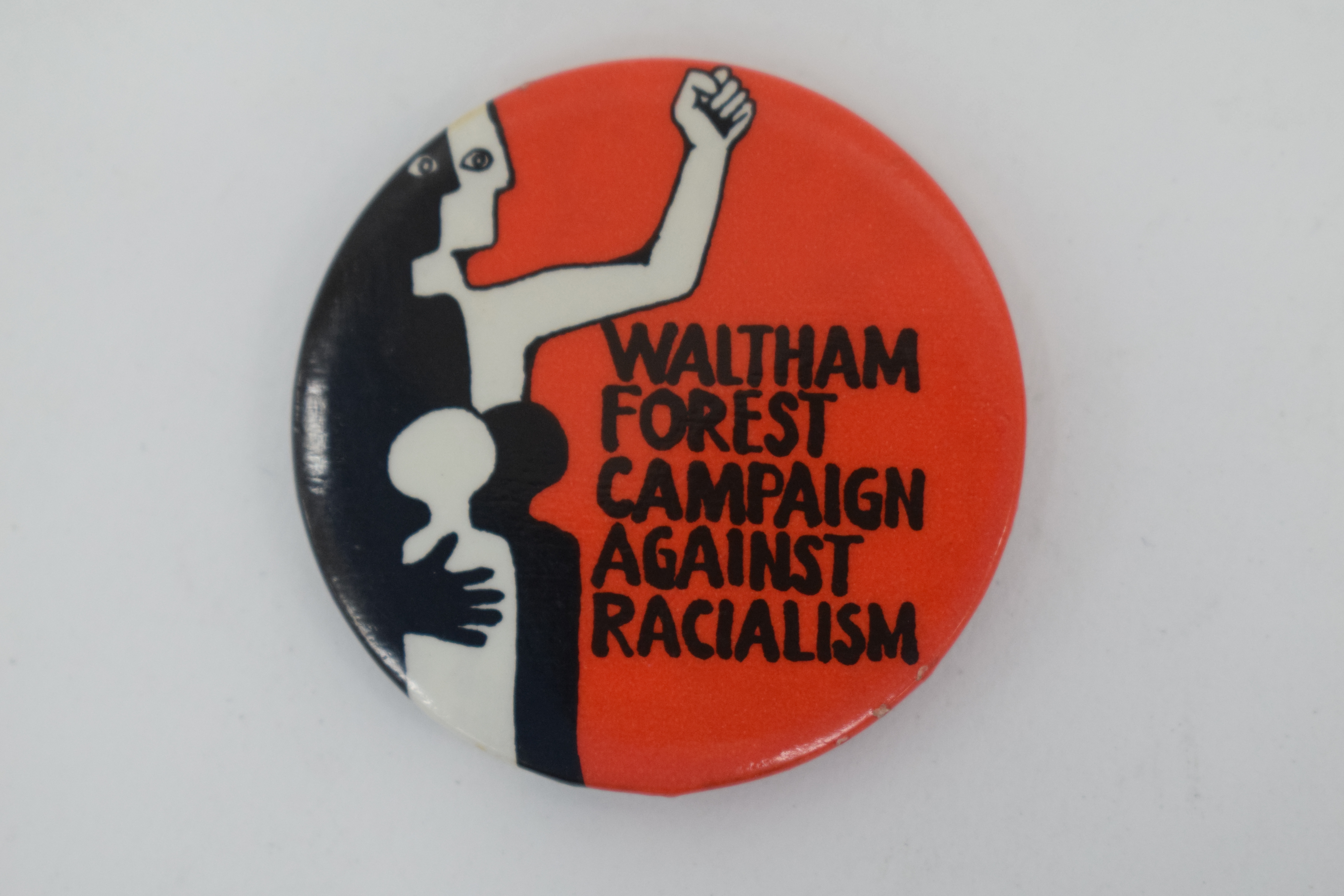 Round red badge, "Waltham Forest Campaign Against Racialism" in black text. On the left side is a stylised illustration of two adults and two children in black and white.