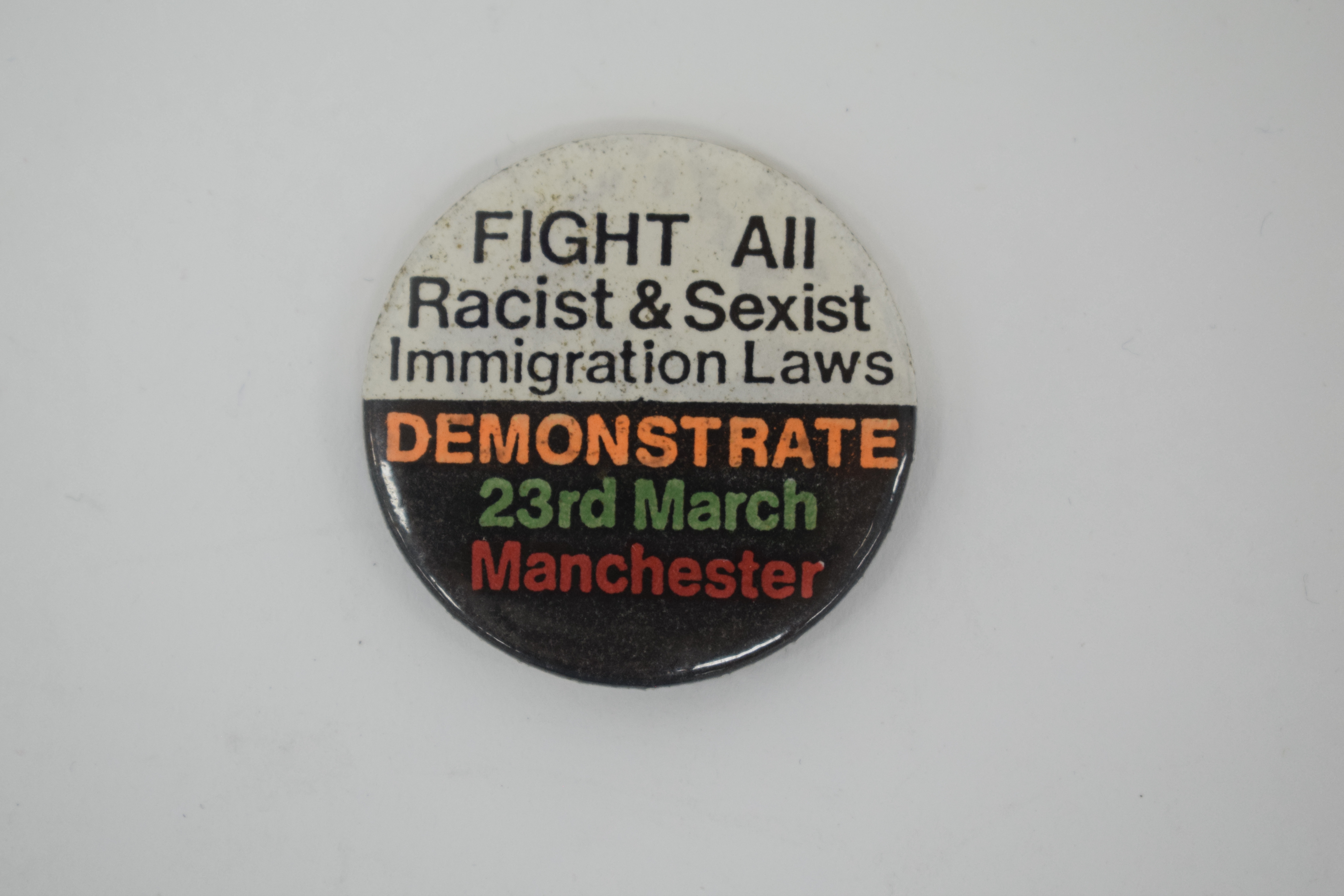 Round black and white badge, "Fight All Racist & Sexist Immigration Laws - Demonstrate 23rd March Manchester" in black, orange, green and red text.