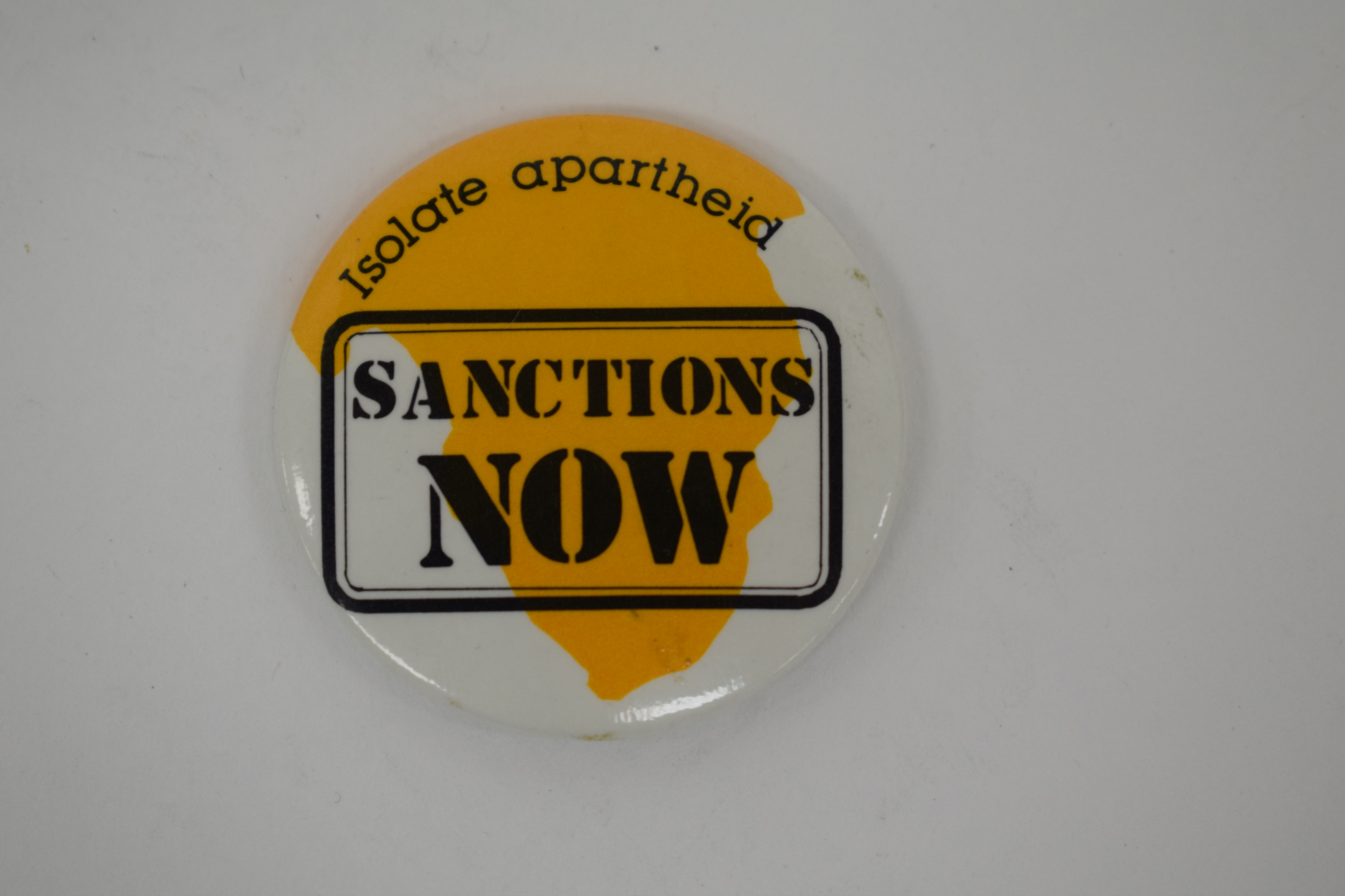 Round white badge, "Sanctions now - isolate apartheid" in black text on an orange map of the south of Africa.